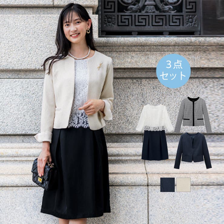 上品なツイードジャケットが2着セットになった、着回し自在なアイテム。 ジャケットを変えるだけで印象をチェンジできるから、卒業式も入学式もこのセットでOK。 ワンピは上品なレース使いとスカート部分のタックで、フェミニンな印象に。 単品使いもできてお得です。 <3点セット>●2ジャケット●ワンピース ■ 品質/〈表地〉(ジャケット・ワンピース袖・スカート)ポリエステル100% (ワンピース身頃レース)ナイロン45%、綿40%、レーヨン15%● 裏地付(ジャケット総裏・ワンピース身頃のみ)【白黒ツイードジャケット】● フロントホック4ケ留め仕様● ポケット有【オフベージュ/ネイビージャケット】● フロントホック1ケ留め仕様● 袖口スリット有● ポケット有【ワンピース】● 7分袖● ファスナー後※ 商品によってレースの出方が異なる場合があります。 ■ サイズは画像にございます■取扱い/ドライ-----------------------------------------------------------------------------------------※サイズ寸法は実際の寸法と多少の誤差がある場合がございます。 ※ご覧いただいているPC/WEB環境や撮影環境により、多少色味が異なって見える場合がございます。 【お買物をよりお楽しみいただく為に】▼商品のお気に入り登録をおすすめします♪『?をクリック!』完売カラーの再入荷などの通知を受ける事ができます。 ブランドのお気に入り登録もご一緒にお願いいたします。 -----------------------------------------------------------------------------------------206297セレモニー セレモニースーツ フォーマルスーツ 3点セット セットアップ 春 春服 卒業式 卒園式 入学式 入園式 入社式 卒入 入卒 10代 20代 30代 40代 50代 60代 オケージョン 冠婚葬祭 通勤 通学 フォーマル オフィスカジュアル レディース オフィス スーツ パンツスーツ ブラックフォーマル ママスーツ リクルート リクルートスーツ 仕事 仕事用 七五三 秋 秋服 体型カバー 体系カバー返品・交換について購入後の交換は受け付けておりません。 予めご了承ください。 返品を希望される場合は購入履歴一覧の「ショップへの問い合わせ」よりお問い合わせください。 =========================複数配送先指定について1件の注文に対して、異なる住所への配送は対応出来かねます。 恐れ入りますが、異なる住所へ配送をご希望の場合、配送先毎に分けて注文いただきますようお願い申し上げます。 【スーツ・フォーマルウェアWOMEN】7号(XS) 9号(S) 11号(M) 13号(L) 15号(XL) 17号(XXL) 白黒×オフベージュ 白黒×ネイビー白黒×オフベージュ 白黒×ネイビー 【10%OFFクーポン!2/10(火)1:59まで】GeeRA 【2ツイードジャケット&ワンピ】入卒式/セレモニー着回し3点セットワンピーススーツ スーツ 9,999 ~