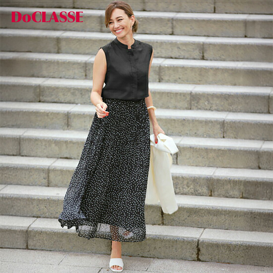 素材表地・裏地/ポリエステル100%洗濯表示手洗い可サイズ詳細サイズ着丈ウエストヒップ7号89631019号896610411号896910713号897211015号8975113・色:マルチ / ドット・注意事項:モニターの発色具合により色合いが異なる場合がございます。 【関連キーワード】 DoCLASSE ドゥクラッセ 大人の服 30代 40代 50代 レディース メンズ きれいめ 大人カジュアル オフィスカジュアル 通勤 旅行 体型カバー 着痩せ ストレッチ 洗える 防シワ 速乾 接触冷感 UVカット 撥水 保温 裏起毛 軽量 セットアップ ワンピース シャツ ブラウス Tシャツ カットソー ニット セーター カーディガン パンツ スカート コート ダウン ブルゾン ジャケット ベスト バッグ ゴルフ マジカルサーモ Doヒートアコーディオンプリーツ・マキシスカートほっそり魅せの秘密は「ランダムプリーツ」。 シアー素材の揺れ感プリーツスカートマルチドットほのかに透けるシフォンジョーゼットを、女性らしく着こなせるランダムプリーツのマキシスカートに仕立てました。 プリントはドットとマルチ(幾何柄)という2柄展開。 シーンを問わず取り入れやすく、着こなしに華を添える、シックなカラーとパターンにこだわりました。 計算されたプリーツが大人のカラダをすっきり見せ腰まわりは細幅プリーツでボリュームを抑え、膝下からはひだの折り目をつけないプレーンなデザインで美しいAラインのシルエットを実現。 「下着の透け」を気にせず、「透け感」だけを楽しめるしなやかにストレッチする裏地付きだから、下着の透けも気にならず着こなしていただけます。 華やかな場もOKのセットアップスタイル 同素材のブラウス(30085)と合わせて、パーティなど華やかな場にも映えるセットアップスタイルもお楽しみいただけます。