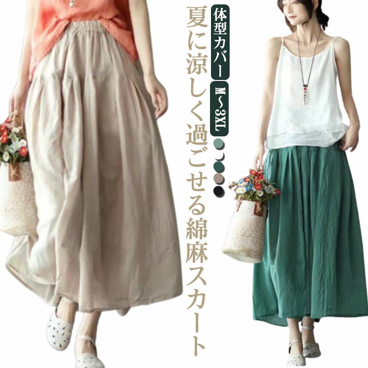 おしゃれ ロング丈 レトロ ナチュラル 綿麻 大きいサイズ 春夏 カジュアル フレア 薄手 スカート ロングスカート 森ガール マキシ ウエストゴム マキシスカート ゆったり 体型カバー ストレスフリー 通勤 通学 ふんわり 2,150 ~