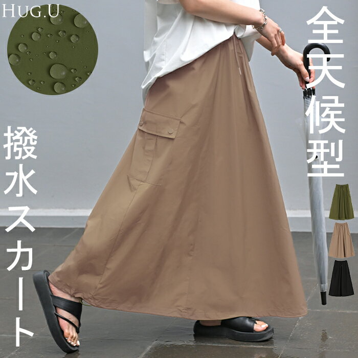 スカート 撥水 ロング はっ水 レディース ボトムス ロングスカート カーゴ ゴム ハイウエスト 軽量 無地 マキシ マキシスカート 軽い フレア フレアスカート Aライン ドロスト 雨の日 体型カバー 大きいサイズ カーキ 雨 黒 春 夏 HUG.U 5,500 ~