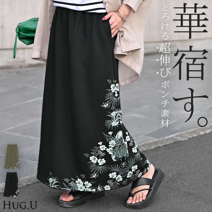 スカート ロング 花柄 Aライン レディース ロングスカート ボトムス ボトム フレア フレアスカート マキシ マキシスカート 無地 長い ゆったり きれいめ ポンチ ポケット シック ストレッチ ハイウエスト フラワー おしゃれ 黒 カーキ 春 夏 HUG.U 4,500 ~