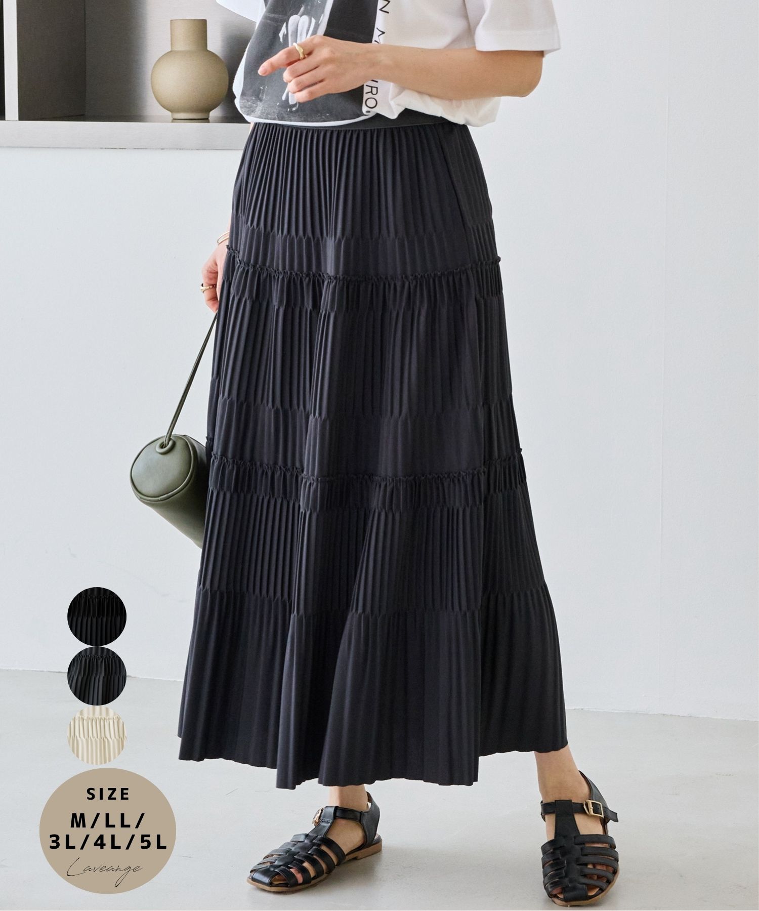 商品情報素材/材質ポリエステル 96% ポリウレタン 4%サイズ/寸法M/総丈86ウエスト64?120 LL/総丈87ウエスト75?131 3L/総丈87ウエスト83?139 4L/総丈87ウエスト91?147 5L/総丈87ウエスト99?155お手入れ方法石油系溶剤ドライクリーニング 弱い処理■商品注意事項■※商品画像は、光の当たり具合やパソコンなどの閲覧環境により、実際の色味と異なって見える場合がございます。 予めご了承ください。 ※生地アップの画像が、実際の商品に一番近い色味となりますので、ご参照ください。 ※末永く愛用頂く為に、アテンションタグ・洗濯ネームを必ずご確認の上、着用又はお取り扱い下さい。 ※生産時期により色味が多少異なる場合がございます。 予めご了承ください。 evidence メーカー希望小売価格はメーカー商品タグに基づいて掲載していますlaveange プリーツティアードロングスカート プリーツスカート ロングスカート ティアードスカート ウエストゴム 体型カバー きれいめ M LL 3L 4L 5L 5762030 カジュアル 大人カジュアル フレアスカート シーズンレス 楽ちん レディース ■デザイン細かなプリーツとティアード風の切り替えデザインを組み合わせた、表情豊かなロングスカート。 段状に入れたシャーリングが立体感を生み、歩くたびにやわらかく揺れるシルエットが魅力です。 ウエストは総ゴム仕様でストレスフリーな穿き心地。 落ち感のあるシルエットで、上品さとリラックス感を両立した一枚です。 ■素材厚手のカノコ(鹿の子)ポンチ素材を使用。 程よいハリと落ち感があり、プリーツの立体感をきれいにキープします。 さらりとした肌触りでシワになりにくく、シーズンレスで着用できるのも魅力です。 ■コーディネートシンプルなカットソーを合わせるだけで、コーディネートが決まる主役スカート。 コンパクトなトップスを合わせてすっきり着こなすのはもちろん、ジャケットやカーディガンと合わせた大人カジュアルなスタイルにもおすすめです。 フラットシューズからパンプスまで幅広く合わせやすく、オン・オフ問わず活躍します。 ・ウエスト総ゴム仕様・お手入れ方法:石油系溶剤ドライクリーニング 弱い処理・マルチサイズ/大きいサイズ対応(M/LL/3L/4L/5L)---------------------------------------透け感:なし・オフベージュ/ややあり裏地:なし伸縮性:ややあり生地の厚さ:やや厚手---------------------------------------■商品注意事項■※商品画像は、光の当たり具合やパソコンなどの閲覧環境により、実際の色味と異なって見える場合がございます。 予めご了承ください。 ※生地アップの画像が、実際の商品に一番近い色味となりますので、ご参照ください。 ※末永く愛用頂く為に、アテンションタグ・洗濯ネームを必ずご確認の上、着用又はお取り扱い下さい。 ※生産時期により色味が多少異なる場合がございます。 予めご了承ください。 【原産国】中国【素材】ポリエステル 96% ポリウレタン 4%【品番】5762030 5 laveange プリーツティアードロングスカート プリーツスカート ロングスカート ティアードスカート ウエストゴム 体型カバー きれいめ M LL 3L 4L 5L 5762030 8,910 ~