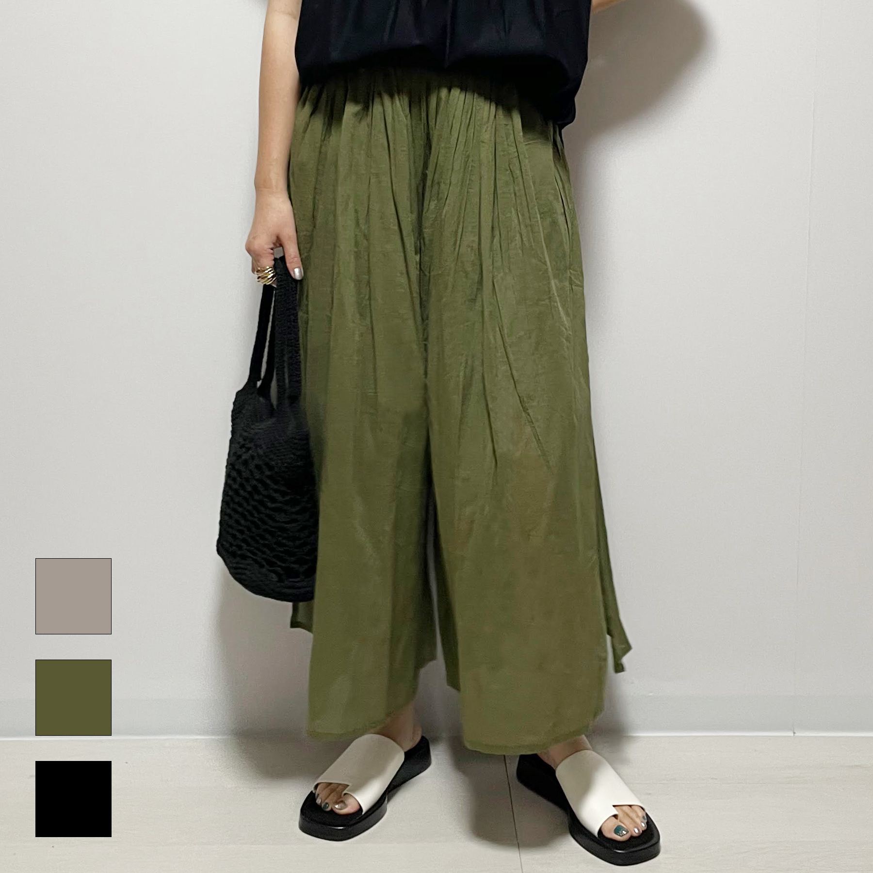 【綿ボイル 裾スリットワイドパンツ】◆スカートライクなボリュームたっぷりワイドパンツ◆スカートのように見えて、足さばき良く動きやすいギャザーパンツ。 生地をたっぷりと仕様したフレアシルエットが可愛い一枚です。 裾のサイドスリットデザインがさりげないポイント。 ウエストゴムでリラクシーな着心地です。 コットンボイル生地は、ふんわり軽い着心地で暑い季節ににぴったり。 ハリ感もしっかりあるのでシルエットが綺麗に見えます。 【Mサイズ】総丈:88cmウエスト:70〜120cmもも周り(表地):130cmもも周り(裏地):78cm股上:42cm裾幅:67cm※平置き採寸になります。 若干の誤差が生じる場合がございます。 【素材】表地:綿100%裏地:綿100%【伸縮性】なし【透け感】表地ややあり【モデル着用サイズ】Mサイズ【モデル体型】身長:161cm※撮影小物やインナーを使用しておりますが商品には含まれません。 ※ご覧になっているモニターや環境などにより実際の商品と多少色味が異なって見える場合がございます。 予めご了承をお願いいたします。 【ワイドパンツ レディース 春 夏 裾 スリット 大人 体型カバー ゆったり 20代 30代 40代 50代】メーカー希望小売価格はメーカーサイトに基づいて掲載しています▼タイムセール開催中!▼