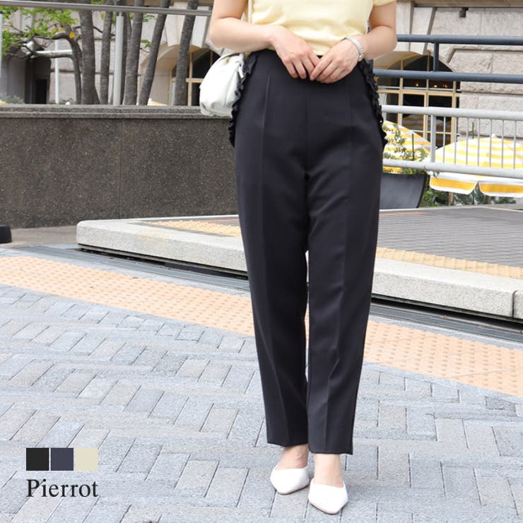 女性らしさを引き立てる一本“ポケットフリルテーパードパンツ”レーヨン混で程良く落ち感があり、滑らかな素材を使用。 しっかりとした生地感で高見えする一枚です。 ポケットに施したフリルデザインがアクセントかつ、目を惹く旬な一本。 コーディネートにさり気ない女性らしさをプラスしてくれます。 センタープレスとスタンダードなテーパードラインがきれいなシルエットをキープしてくれるところも嬉しいポイント。 シンプルなトップスに合わせるだけで華やかな着こなしに仕上がります。 ※商品画像は着用イメージです。 光や角度により、実物と色味が異なる場合がございます。 また表示のサイズ感も実物とは若干異なる場合もございますので、予めご了承ください。 【お買い物を楽しむための方法】**商品のお気に入り登録**カートボタン横のハートをクリック!気になるアイテムがお得になると通知が届きます。 チャンスをのがしません♪**ブランドのお気に入り登録**ブランドトップページの「お気に入りに追加」をクリック!新商品の情報を受け取ることができます。 【ブランド】Pierrot(ピエロ)【スペック】■サイズ P/M/L■実寸(約cm)【ウエスト/ヒップ/前股上/後股上/股下/ワタリ幅/裾幅】PM:33-37/47/31/42/66/31.5/17M:33-37/47/31/42/70/31.5/17L:35-39/49/32/43/70/32.5/18※実寸(平置きした状態でメジャー計測)の為、タグ表記のサイズとは異なります。 ■素材ポリエステル80%/レーヨン15%/ポリウレタン5%■洗濯表示液温は40℃を限度とし、手洗いができる塩素系及び酸素系漂白剤の使用禁止タンブル乾燥禁止底面温度110℃を限度としてアイロン仕上げができる(あて布使用)石油系溶剤による弱いドライクリーニングができる弱い操作によるウェットクリーニングができる■備考透け感(淡色):あり透け感(濃色):なし伸縮性:なし裏地:なしポケット:あり(バックポケットはフェイク)ファスナー:ありライトベージュに透け感が生じます。 ペチコートなどの着用をおすすめいたします。 ■ご注意・生地のカッティングにより画像と異なる場合がございます。 同商品、同色におきましても色(染料)やロットによって伸縮性・伸び率、裁断上ずれなどが生じてしまう現象があります。 また、プリント加工の際に、インク飛びが目立ってしまう場合がございますが、手法上致し方ない現象となりますので、なにとぞご了承くださいませ。 ・同生産時期でも、色、サイズ、デザイン、素材の質感が多少異なる場合がございます。 サイズ詳細などの測り方はスタッフ間で統一、徹底はしておりますが、若干の誤差(約2〜3cm誤差)がある場合がございます。 また、ニット製品は生産の過程上「生地を織る際の糸の継ぎ目」繊維の「混紡」、プレス加工、製品洗い加工によって形やサイズ(5cm前後)に誤差が生じる場合がございますが品質上の問題はございません。 返品・交換について購入後の交換は受け付けておりません。 予めご了承ください。 返品を希望される場合は購入履歴一覧の「ショップへの問い合わせ」よりお問い合わせください。 =========================複数配送先指定について1件の注文に対して、異なる住所への配送は対応出来かねます。 恐れ入りますが、異なる住所へ配送をご希望の場合、配送先毎に分けて注文いただきますようお願い申し上げます。 【パンツ・ズボンWOMEN】ブラック ネイビー ライトベージュ PM M L 【20%OFF!2/5(木)限定】Pierrot ポケットフリルテーパードパンツ ☆ テーパードパンツ フリル 美シルエット 華やか センタープレス レーヨン混 落ち感 高見え ピエロ パンツ・ズボン 3,861 ~