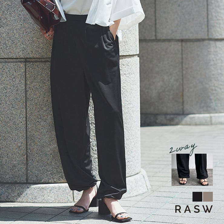 しなやかでありながら程良い伸縮性を実現。 落ち感素材がドレープを生み出し、ほんのりとした光沢が品のある輝きを放ちます。 滑らかな肌触りで、着心地も抜群に良い一枚です。 ドローストリング仕様の裾で自由にシルエットを調整でき、気分やスタイルに合わせて変化を楽しめる一枚。 ストレートラインとジョガーシルエットの2way仕様で、リラックス感とシャープさを兼ね備えています。 後ろウエストはバックゴム仕様で、どんな時でも快適な着心地をキープします。 ※商品画像は着用イメージです。 光や角度により、実物と色味が異なる場合がございます。 また表示のサイズ感も実物とは若干異なる場合もございますので、予めご了承ください。 【お買い物を楽しむための方法】**商品のお気に入り登録**カートボタン横のハートをクリック!気になるアイテムがお得になると通知が届きます。 チャンスをのがしません♪**ブランドのお気に入り登録**ブランドトップページの「お気に入りに追加」をクリック!新商品の情報を受け取ることができます。 【ブランド】RASW(ラス)【スペック】■実寸(約cm)S:ウエスト32-46cm|ヒップ53cm|前股上33.5cm|後股上40.5cm|股下69cm|ワタリ幅36cm|裾幅23cm|M:ウエスト34-48cm|ヒップ55cm|前股上34cm|後股上41cm|股下71cm|ワタリ幅37cm|裾幅24cm|L:ウエスト36-50cm|ヒップ57cm|前股上34.5cm|後股上41.5cm|股下73cm|ワタリ幅38cm|裾幅25cm|※実寸(平置きした状態でメジャー計測)の為、タグ表記のサイズとは異なります。 ■素材ポリエステル92%/ポリウレタン8%■洗濯表示液温は30℃を限度とし、洗濯機で非常に弱い洗濯ができる塩素系及び酸素系漂白剤の使用禁止タンブル乾燥禁止日陰のつり干しがよい底面温度120℃を限度としてアイロン仕上げができる(あて布使用)石油系溶剤又はデカメチルペンタシクロシロキサンによる弱いドライクリーニングができる非常に弱い操作によるウェットクリーニングができる■備考透け感:なし伸縮性:あり裏地:なしポケット:ありファスナー:なし光の加減で透け感が生じる場合がございます。 ■ご注意・生地のカッティングにより画像と異なる場合がございます。 同商品、同色におきましても色(染料)やロットによって伸縮性・伸び率、裁断上ずれなどが生じてしまう現象があります。 また、プリント加工の際に、インク飛びが目立ってしまう場合がございますが、手法上致し方ない現象となりますので、なにとぞご了承くださいませ。 ・同生産時期でも、色、サイズ、デザイン、素材の質感が多少異なる場合がございます。 サイズ詳細などの測り方はスタッフ間で統一、徹底はしておりますが、若干の誤差(約2〜3cm誤差)がある場合がございます。 また、ニット製品は生産の過程上「生地を織る際の糸の継ぎ目」繊維の「混紡」、プレス加工、製品洗い加工によって形やサイズ(5cm前後)に誤差が生じる場合がございますが品質上の問題はございません。 返品・交換について購入後の交換は受け付けておりません。 予めご了承ください。 返品を希望される場合は購入履歴一覧の「ショップへの問い合わせ」よりお問い合わせください。 =========================複数配送先指定について1件の注文に対して、異なる住所への配送は対応出来かねます。 恐れ入りますが、異なる住所へ配送をご希望の場合、配送先毎に分けて注文いただきますようお願い申し上げます。 【パンツ・ズボンWOMEN】ブラック グレージュ S M Lブラック グレージュ 【20%OFF!2/5(木)限定】Pierrot [RASW]2wayストレートラフパンツ ☆ パンツ 2way ジョガー ストレート ドレープ ドローストリング仕様 バックゴム RASW ピエロ パンツ・ズボン 6,299 ~