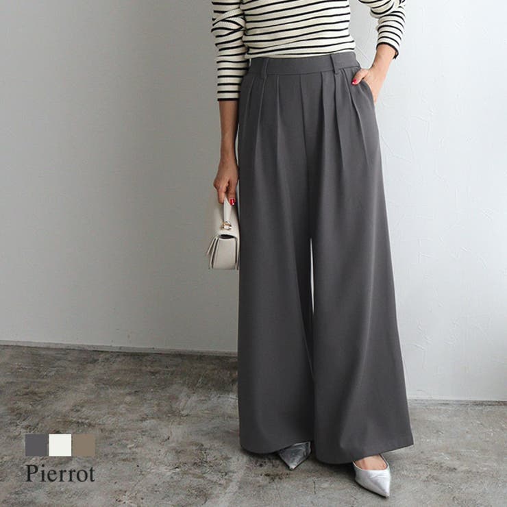 リラクシーな大人スタイルを叶える“ハイウエストタックワイドパンツ”レーヨン混で柔らかさがありつつ、程良いハリ感がきちんと感を演出。 シーズンレスで着用できる一枚。 裾に向かってボリュームのあるルーズなワイドパンツがトレンドライクな一枚。 ウエストのタックが腰周りはすっきり見せつつ、脚のラインを拾わない優秀シルエット。 ハイウエストデザインなので、短丈トップスやハイゲージトップスとの相性も◎※商品画像は着用イメージです。 光や角度により、実物と色味が異なる場合がございます。 また表示のサイズ感も実物とは若干異なる場合もございますので、予めご了承ください。 【お買い物を楽しむための方法】**商品のお気に入り登録**カートボタン横のハートをクリック!気になるアイテムがお得になると通知が届きます。 チャンスをのがしません♪**ブランドのお気に入り登録**ブランドトップページの「お気に入りに追加」をクリック!新商品の情報を受け取ることができます。 【ブランド】Pierrot(ピエロ)【スペック】■サイズPM/M/L■実寸(約cm)【ウエスト/ヒップ/前股上/後股上/股下/ワタリ幅/裾幅】PM:32-38/47/32.5/43.5/65/37.5/35M:32-38/47/32.5/43.5/69/37.5/35L:34-40/49/33.5/44.5/69/38.5/36※実寸(平置きした状態でメジャー計測)の為、タグ表記のサイズとは異なります。 ■素材ポリエステル80%/レーヨン20%[裏地]ポリエステル100%■洗濯表示液温は40℃を限度とし、手洗いができる塩素系及び酸素系漂白剤の使用禁止タンブル乾燥禁止底面温度110℃を限度としてアイロン仕上げができる(あて布使用)石油系溶剤による弱いドライクリーニングができる弱い操作によるウェットクリーニングができる■備考透け感:なし伸縮性:なし裏地:ありポケット:ありファスナー:あり■ご注意・生地のカッティングにより画像と異なる場合がございます。 同商品、同色におきましても色(染料)やロットによって伸縮性・伸び率、裁断上ずれなどが生じてしまう現象があります。 また、プリント加工の際に、インク飛びが目立ってしまう場合がございますが、手法上致し方ない現象となりますので、なにとぞご了承くださいませ。 ・同生産時期でも、色、サイズ、デザイン、素材の質感が多少異なる場合がございます。 サイズ詳細などの測り方はスタッフ間で統一、徹底はしておりますが、若干の誤差(約2〜3cm誤差)がある場合がございます。 また、ニット製品は生産の過程上「生地を織る際の糸の継ぎ目」繊維の「混紡」、プレス加工、製品洗い加工によって形やサイズ(5cm前後)に誤差が生じる場合がございますが品質上の問題はございません。 返品・交換について購入後の交換は受け付けておりません。 予めご了承ください。 返品を希望される場合は購入履歴一覧の「ショップへの問い合わせ」よりお問い合わせください。 =========================複数配送先指定について1件の注文に対して、異なる住所への配送は対応出来かねます。 恐れ入りますが、異なる住所へ配送をご希望の場合、配送先毎に分けて注文いただきますようお願い申し上げます。 【パンツ・ズボンWOMEN】ネイビー グレージュ PM M L 【10%OFFクーポン!2/10(火)1:59まで】Pierrot ハイウエストタックワイドパンツ ☆ ワイドパンツ ハイウエスト タック レーヨン混 ルーズ トレンドライク ピエロ パンツ・ズボン 3,213 ~