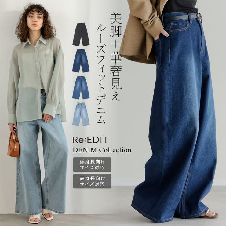 絶妙なフィット&ワイドを叶える最新バギーデニム[DENIM COLLECTION][低身長/高身長サイズ有]コットンブレンドルーズフィットバギーデニムパンツ▼デザイン裾に向かって緩やかに広がるバギーデニムパンツ。 腰回りは程よいフィット感、ワイドながらもウエストは細見えし、美しいシルエットを叶えます。 横から見たシルエットも大人のモードなこなれ感を演出。 シンプルなデニムコーデも、自然と今っぽく仕上がります。 しっかりとハリ感のある絶妙な厚みのデニムで、シルエットはしっかりキープ。 脚がすらりと長く見えるこだわりのワイドシルエットで、毎日のデニムコーデの幅が広がります。 ▼コーディネートコンパクトなトップスと合わせるのがおすすめ。 トップスをインした着こなし以外にも、ジャケットやシャツ羽織り、ペプラムトップスともバランスよく着用いただけます。 足元はヒールのあるものを合わせるとさらにスタイルアップが叶います。 ▼素材12.5オンスのコットン100%デニム生地▼お取り扱いについて※この製品は摩擦(特に湿った状態での摩擦)や、汗や雨などで濡れた際に、他の衣類や下着(特に白)等に色移りする場合がありますので十分にご注意ください。 ※色移りした場合は、速やかに洗濯またはクリーニングに出してください。 ※洗濯やクリーニングの際、多少色落ちすることがありますので、単品洗い、単品クリーニングをしてください。 洗剤の量が多いと、色落ちの度合いが高くなりますのでご注意ください。 ※速やかに脱水、乾燥をしていただけますようお願いいたします。 ※サイズ実寸(約cm) 【前股上/後股上/股下/ウエスト/ヒップ/わたり幅/裾幅】SC:30.3/40.6/67/64/97/32.5/30.5M:31.8/42.1/70.5/68/101/33.5/31.5MT:33.3/43.6/74/68/101/33.5/31.5L:32.3/42.6/71.5/72/105/34.5/32.5返品・交換について購入後の交換は受け付けておりません。 予めご了承ください。 返品を希望される場合は購入履歴一覧の「ショップへの問い合わせ」よりお問い合わせください。 =========================複数配送先指定について1件の注文に対して、異なる住所への配送は対応出来かねます。 恐れ入りますが、異なる住所へ配送をご希望の場合、配送先毎に分けて注文いただきますようお願い申し上げます。 【パンツ・ズボンWOMEN】ブラック(501) ネイビー(711) ブルー(511) ライトブルー(611) SC(420) M(330) MT(530) L(340)ブラック(501) ネイビー(711) ブルー(511) ライトブルー(611) Re:EDIT [DENIM COLLECTION][低身長/高身長サイズ有]コットンブレンドルーズフィットバギーデニムパンツ パンツ・ズボン 5,998 ~