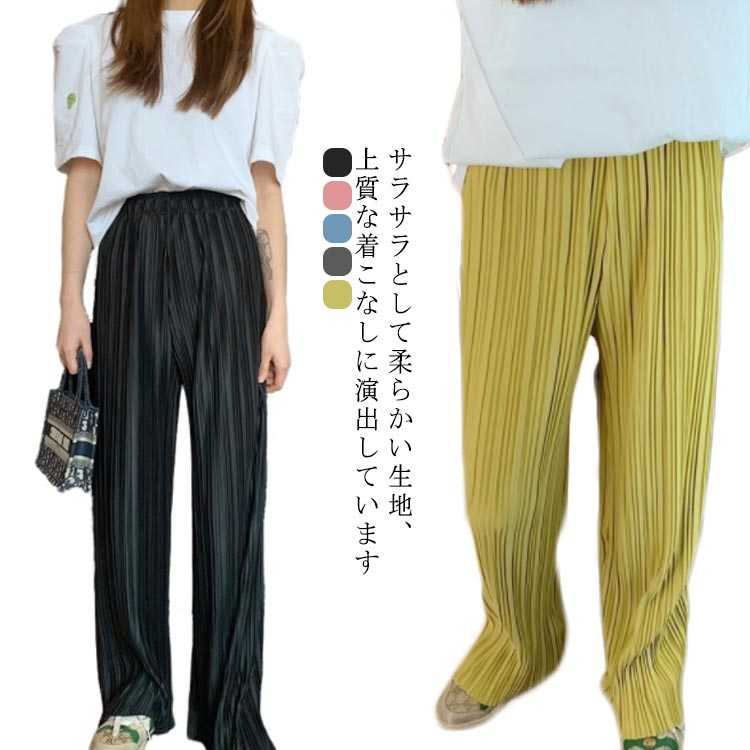 シンプル 大人 オフィス 無地 ウエストゴム センタープレス ズボン レディース プリーツ きれいめ ボトムス パンツ ワイドパン 3,070 ~