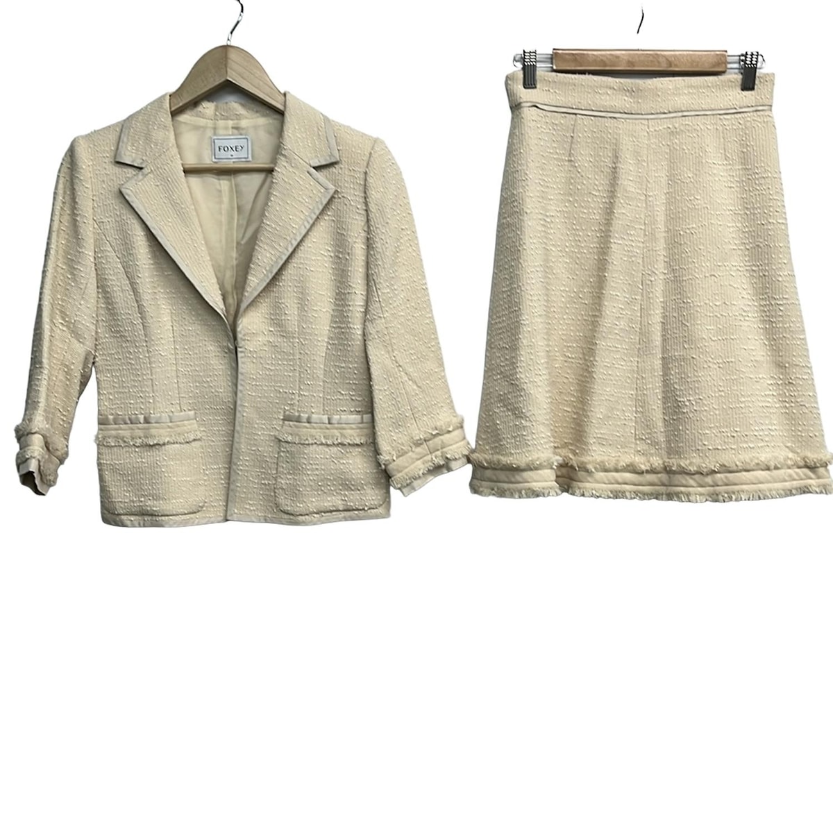 ※『USED品』です。 お客様都合による商品のご返品は一切承っておりませんので商品情報・画像を参考にご購入ください。 ※左右・前後で総丈の長さが違う場合は、最短と最長の長さを以下のように表示します。 例)80?90cm (最短が80cm、最長が90cm) ≫ 配送について ≫ご利用ガイド ≫よくある質問【中古】FOXEY(フォクシー) スカートスーツ ツイード アイボリー ジャンル スカートスーツ ブランド FOXEY(フォクシー) 商品名 -型番 34180男女別 レディース表記サイズ トップス38/パンツ38実寸サイズ ■ジャケット肩幅 : 約 39 cm袖丈 : 約 43 cm身幅 : 約 44 cm着丈 : 約 54 cm■スカートウエスト : 約 66 cm (半身×2のサイズ)総丈 : 約 54 cmカラー アイボリーデザイン -ツイード 素材 画像参照コンディションレベル 【C】ふつうに使える コンディションの備考 【ジャケット外側】 ・袖口 ⇒ 小さな汚れ若干【ジャケット内側】 ・首周り ⇒ 小さな汚れ若干【スカート外側】 ・全体的 ⇒ 色褪せ若干【スカート内側】 ・全体的 ⇒ ほつれ若干【特記事項】 ・保存時のニオイあり製造番号・刻印 -シリアル *** 付属品 なし 【中古】FOXEY(フォクシー) スカートスーツ ツイード アイボリー 23,514 ~