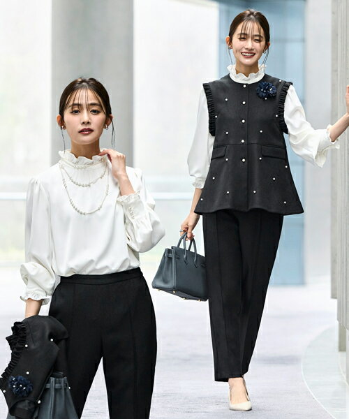 Black x White Charcoal x White Navy x White Detail 商品詳細 【3点set】ドレスアップ・ペプラムジレ&スリムテーパードパンツ フリルブラウス付き(SU1673) 【ジレ】と【ブラウス】と【パンツ】の3点セット 【もう迷わない!ハレの日コーデがこのワンセットで完成!】 パールデザインが今っぽい。 可愛いママのリアルバイ・セットスーツ "ハレの日"も普段使いにも楽しめる ママになると意外と多いセレモニーシーン。 品よく華やかで特別な日にふさわしいお洋服で挑みたいもの。 ルイルエのセレモニー服は、式典以外にも学校行事や発表会 きちんとした装いが必要な時にも、幅広いシーンで活躍してくれます♪ 【オケージョン】 ― シーンやスタイルに合わせて着回し自在 ― ・卒園・卒業式 ・入園・入学式 ・パーティー セットでも単品でも使える!着回し力たっぷりの3点セット ・スタイルアップが叶うペプラムスタイルのジレ。 パールデザインが今っぽく、肩のフリルもポイントです。 ・襟フリルと袖口のフリルがポイントのブラウス。 カフスに並んだパールボタンがアクセントに。 ・センターピンタックで細見えを叶えてくれるスリムテーパードパンツ。 【ディテール】 ◆ジレ スタイルアップが叶う、ペプラムスタイルのジレ。 パールデザインが今っぽく、肩のフリルもポイントです。 ・開き具 開き具はパールボタン5つです。 ・肩フリル 肩先はフリル付きで華やかな印象に。 ・ポケット フロントにフラップポケットが付いています。 ◆ブラウス 襟フリルと袖口のフリルがポイントのブラウス。 カフスに並んだパールボタンがアクセントに。 ・襟 フリル襟が顔周りを華やかにしてくれます。 ・開き具 開き具はパールボタン&共地ループです。 ・袖口 袖口のフリルがポイント。 カフスに3つ並んだパールボタンで開閉可能です。 ◆パンツ スリムテーパードのすっきりシルエットに、 センターピンタックで端正な印象をプラス。 ・フロント 履き込みタイプですっきりとしています。 ・ウエストゴム 後ろウエストはゴム仕様で楽な着心地です。 ・ポケット 左右に便利なシームポケット付き。 ◆裏地 ジレは総裏仕様、パンツはストレッチ性のある半裏仕立てで動きやすさも抜群です。 さらりとした肌ざわりで、幅広い季節に対応しています。 ◆生地 トップス:オケージョンにもGOODな艶感。 イージーケアで、シワになりにくい生地。 ・手洗い可能なウォッシャブル仕様 ご家庭で洗えるウォッシャブル生地を使用しているので、クリーニングに出す手間も省け、いつでも洗い立ての着心地でお過ごしいただけます。 洗濯機には入れず、優しく手洗いして下さい。 洗剤はおしゃれ着用の中性洗剤がおすすめです ジレ・パンツ共通:ボディラインを拾いにくいハリ感。 ムードがあり、高見えするポリエステルクロス。 【カラーバリエーション】 ・ブラック×ホワイト ・チャコール×ホワイト ・ネイビー×ホワイト サイズ サイズ ジレ *着丈 バスト ウエスト 肩幅 S7号 64 92 96 35 M9号 65 96 100 36 L11号 66 100 104 37 LL13号 67 104 108 38 ブラウス *着丈 バスト 肩幅 袖丈 S7号 62 96 36 58 M9号 63 100 37 59 L11号 64 104 38 60 LL13号 65 108 39 61 パンツ パンツ丈 ウエスト ヒップ 股下 渡り 裾幅 S7号 93 64?92.5 92.5 68 31 15.5 M9号 94 68?96.5 96.5 32 16.5 L11号 95 72?100.5 100.5 33 17.5 LL13号 96 76?104.5 104.5 34 18.5 *=SNP(ショルダーネックポイント) ■サイズガイド■ 素 材 【ジレ・パンツ】 表地:ポリエステル 100% 裏地:ポリエステル 100% 【ブラウス】ポリエステル 90% ポリウレタン 10% 商品仕様 ◆伸縮性:【ジレ・パンツ】なし 【ブラウス】あり ◆裏地:【ジレ】あり 【ブラウス】なし 【パンツ】半裏 ◆開き具:【ジレ】前開き パール釦 5個 【ブラウス】後ろ開き パール釦+共地ループ 1セット 【パンツ】なし(後ろウエストゴム) ◆カラー:ブラック×ホワイト/チャコール×ホワイト/ネイビー×ホワイト 備 考 ※商品を平置きにし、メジャーにて手作業による採寸をしております。 若干誤差がございます。 サイズ等で不明な点はお問い合わせください。 ◆レビューは商品到着後でお願いします。 ■ご利用ガイド■ 【洗える】2026春新作 レディース セットアップ ママスーツ パンツスーツ セレモニースーツ ジレ ブラウス 3点セット フォーマル ミセス 50代 40代 30代 卒業式 入学式 卒園式 七五三 お宮参り オフィスカジュアル 通勤 母親 服装 上品 大人かわいい 即日発送 プレゼント 20,790 ~