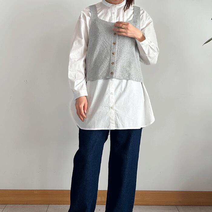 セット内容 ベスト やわらかな肌触りのポリエステルコットンストレート糸を使用。 前後どちらでも着用できる2WAY仕様で、ボタンを前にしても後ろにしても楽しめるデザイン。 季節の変わり目にプラスワンアイテムとして活躍します。 レイヤードスタイルにぴったりな、軽やかで着回し力の高い一枚です。 NAHC60822WAYレイヤードベスト グレー キナリ 素材 ポリエステル66% 綿34% サイズ M 身巾48 着丈49肩ひもを含む L 身巾52 着丈52肩ひもを含む チュニックシャツ 高密度で張りのある平織素材を使用したバンドカラーのチュニックシャツ。 長めの丈で体型をさりげなくカバーしつつ、カーブした裾が軽やかな印象に。 ボトムのポケットを使用しやすい様にカーブを深めに仕上げました。 前開きデザインなので、ボタンを閉じてはもちろん、羽織りとしても便利なアイテムです。 NATS6079バンドカラーチュニックシャツ オフホワイト ネイビー 素材 綿100% サイズ M 身巾58 着丈前83 後ろ88 L 身巾62 着丈前85 後ろ90 パンツ 程よい厚みの9ozデニム&ツイル素材を使用した、ベーシックな5ポケットデザインのストレートパンツ。 ウエストはゴム仕様。 伸縮幅を調整しているので、着用時の見た目はすっきりとしながらも穿き心地のよさを実現しています。 どんなトップスにも合わせやすく、デイリーに活躍する1本です。 NABV6076 5ポケットストレートPT インディゴネイビー キナリ 素材 綿100% サイズ M ウエスト73 総丈97.5 L ウエスト76 総丈100.5 カラー Aオフホワイト×グレー Bネイビー×キナリ 注意事項 この商品は当店実店舗でも販売しております。 在庫数の更新は随時行っておりますが、 お買い上げいただいた商品が、品切れになってしまうこともございます。 その場合、お客様には必ず連絡をいたしますが、万が一入荷予定がない場合は、 キャンセルさせていただく場合もございますことをあらかじめご了承ください。 モニターの発色により実際と異なる場合がありますナチュラルコーデ好きさんにおすすめの休日カジュアルスタイルです。 羽織としても使いやすいチュニックシャツにベストを合わせて、定番のデニムパンツを合わせました。