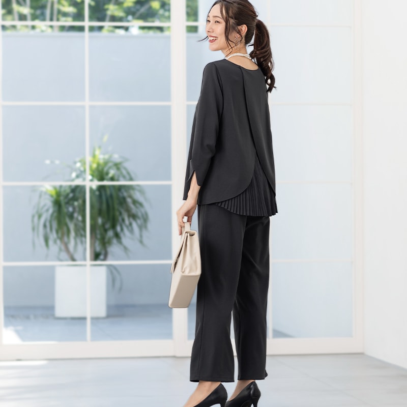 【ジャケット】+【パンツ】の2点セット柔らかなプリーツが目を惹く洗練されたパンツスーツ360度華やかにハレの日を彩りますゆったりAラインのノーカラージャケットとシンプルで着回しの効くスリムパンツのセットアイテム。 セレモニーやお呼ばれシーンからデイリー、オフィスシーンまで幅広く活躍します。 【"ハレの日"も普段使いにも楽しめる】ママになると意外と多いセレモニーシーン。 品よく華やかで特別な日にふさわしいお洋服で挑みたいもの。 ルイルエのセレモニー服は、式典以外にも学校行事や発表会きちんとした装いが必要な時にも、幅広いシーンで活躍してくれます♪【オケージョン】シーンに合わせて着回し自在◆入園・入学式◆卒園・卒業式◆オフィス【セットでも単品でも使える!着回し力たっぷりの2点セット】サイドプリーツが動くたび揺れ華やかで、気になる腰まわりもカバーしてくれます。 縦長効果を発揮するセンタープレス入りパンツ。 デイリーにも着まわせるベーシックなデザイン。 【カラー】・チャコール・ネイビー・ブラック【ディテール】◆ジャケット裾に向かって広がるようデザインされた存在感のあるプリーツが女性らしくエレガントなジャケット。 ストレスなく着用できるゆったりAラインのシルエットで、気になる腰回り〜ヒップをカバーしてくれます。 ・ネックデザインノーカラー&キーネックで顔周りをすっきりとした印象に。 ・開き具ホック開きで楽に着脱していただけます。 ・袖スリットスリット入りで抜け感を演出。 折り返しても着用いただけます。 ・プリーツ両サイドのプリーツが動きに合わせて揺れ、華やかです。 ・裏地総裏仕立てでしっかりとした作りになっています。 プリーツ部分は裏無しで軽い着心地です。 ◆パンツワンタック入りのセンタープレスで足が綺麗に見える細身のテーパードシルエット。 シークレットゴム仕様でウエストもすっきりとスタイリッシュな着こなしを叶えてくれます。 ・開き具ホックとボタンの二重構造でしっかりと留まります。 ・シークレットゴム裏ゴム仕様で動きやすく身体にフィットします。 ・前ポケット左右に便利なポケット付き。 ・飾りポケットヒップ位置を高く見せてくれる飾りポケット。 ・裏地股下までの裏地付きで、下着のラインが響きにくく透け防止にもなっていて快適に履いていただけます。 ◆生地しなやかさと程良いハリ感のある生地はストレッチ性があり動きやすく、長時間の着用でも快適に着て頂けます。 ※ジャケットとパンツは同素材です。 ・ストレッチしなやかでストレッチ性がある素材なので動きやすさはもちろん、長時間の着用でもストレスを感じにくい素材になっています。 ◆サイズ◆【ジャケット】*着丈/バスト/肩幅/袖丈S(7号):63/112/38/55M(9号):64/116/39/56L(11号):65/120/40/57LL(13号):66/124/41/58*=SNP(ショルダーネックポイント)【パンツ】総丈/ウエスト/ヒップ/股下/渡り/裾幅S(7号):96/62〜70/98/67.5/29/15M(9号):97/66〜74/102/67.5/30/16L(11号):98/70〜78/106/67.5/31/17LL(13号):99/74〜82/110/67.5/32/18◆素材◆【ジャケット・パンツ】表 地:ポリエステル 95% ポリウレタン 5%裏 地:ポリエステル 100%◆その他◆[開き具]【ジャケット】前開きスプリングホック 4セット【パンツ】前開きコイルファスナー+ホック 1セット+内釦 1個+ウエスト裏インベルゴム仕様●おすすめシーン入学式(入園式)、卒業式(卒園式)、演奏会、発表会、学校行事、参観、セレモニー、2次会(二次会)、1.5次会、お呼ばれ、女子会、食事会、成人式、同窓会、謝恩会、誕生日会、七五三、お宮参り、パーティー、デート、婚活、街コン、オフィス、通勤、キャリア、ビジネススーツなど、20代・30代・40代・50代まで母親・ママさんにもご活用頂けるフォーマルなレディーススーツです。 S : 【重さ】400g / 【着丈】60cm / 【肩幅】38cm / 【胸囲】108cm / 【袖丈】54cm / 【ウエスト】62cm / 【ヒップ】84cm / 【股上】30cm / 【股下】66cmM : 【着丈】61cm / 【肩幅】39cm / 【胸囲】112cm / 【袖丈】55cm / 【ウエスト】66cm / 【ヒップ】88cm / 【股上】31cm / 【股下】66cmL : 【着丈】62cm / 【肩幅】40cm / 【胸囲】116cm / 【袖丈】56cm / 【ウエスト】70cm / 【ヒップ】92cm / 【股上】32cm / 【股下】66cmLL : 【着丈】63cm / 【肩幅】41cm / 【胸囲】120cm / 【袖丈】57cm / 【ウエスト】74cm / 【ヒップ】96cm / 【股上】33cm / 【股下】66cm別カラーはこちら! グレー(チャコール) ブラック ルイルエブティック RUIRUE BOUTIQUE 2点セット | サイドプリーツ ジャケット & テーパードパンツ セットアップ スーツ | 入園式 入学式 卒業式 卒園式 七五三 ママスーツ セレモニースーツ 14,993 ~