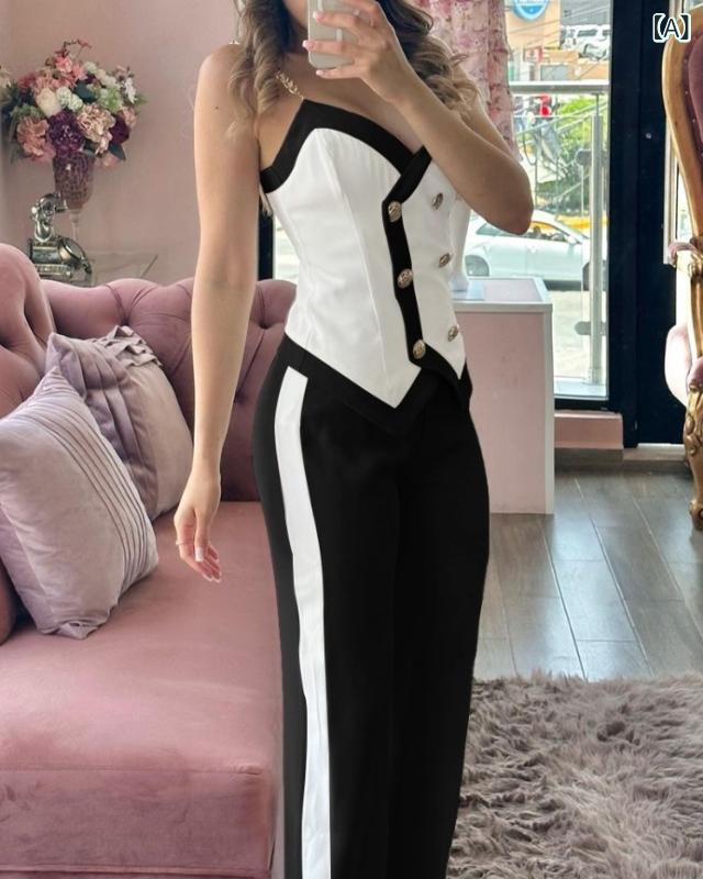 ・丈: ロング丈・デザイン: 切り替え・加工: ノンアイロン加工・素材: スパンデックス・主な素材: 再生繊維・カラー展開: ブラック, コーヒー, ピンク, ブルー, ベージュ, ダークグレー, パープル・サイズ展開: S, M, L・スタイル: エレガントカジュアル, セクシー・主な素材混紡率: 70%〜80%・セットアップの種類: パンツセットアップ・性別: レディース・袖丈: ノースリーブ・カテゴリ: カジュアルセットアップ セットアップ レディース セクシー スリムフィット 伸縮性 ストレッチ カップ付き チューブトップ キャミソール ローライズ 切り替え フレアパンツ ブーツカット ヒップライン強調 再生繊維 スパンデックス 春夏 普段使い カジュアル 4,830 ~