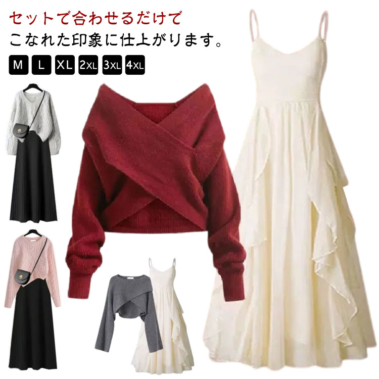 セットで合わせるだけでこなれた印象に仕上がります。 ワンピースは細めリブでスッキリと1枚でも着やすいデザイン。 フロントのクロスデザインが目を惹くこなれニットは、様々なトップスと相性が良く、レイヤードスタイルを楽しんでいただけます。 着回し力も抜群な嬉しいセットワンピースです!1枚で華奢見えが叶うクロスのトップスと人気のシルエットワンピースがセットになった1着。 シンプルだからお手持ちの小物と合わせて自分らしいコーデに。 サイズM L XL 2XL 3XL 4XLサイズについての説明M 体重参考(40-50kg) L 体重参考(50-60kg) XL 体重参考(60-70kg) 2XL 体重参考(70-80kg) 3XL 体重参考(80-90kg) 4XL 体重参考(90-100kg) ※測定方法によって誤差が生じますので、予めご了承下さい。 素材ポリエステル色2点セット01 2点セット02 2点セット03 2点セット04 2点セット05 2点セット06 2点セット07 2点セット08 2点セット09 2点セット10 2点セット11 2点セット12 2点セット13 2点セット14 2点セット15 2点セット16 2点セット17 2点セット18備考サイズ詳細等の測り方はスタッフ間で統一、徹底はしておりますが、実寸は商品によって若干の誤差(1cm〜3cm )がある場合がございますので、予めご了承ください。 商品の色は、撮影時の光や、お客様のモニターの色具合などにより、実際の商品と異なる場合がございます。 あらかじめ、ご了承ください。 ▼色味の強い製品によっては他の衣類などに色移りする場合もございますので、速やかに(脱水、乾燥等)するようにお願いいたします。 ▼▼生地の特性上、やや匂いが強く感じられるものもございます。 数日のご使用や陰干しなどで気になる匂いはほとんど感じられなくなります。 レディース 2点セット クロスニット レディースファッション 超目玉商品 2点セット01 2点セット02 2点セット03 2点セット04 2点セット05 2点セット06 2点セット07 2点セット08 2点セット09 2点セット10 2点セット11 2点セット12 2点セット13 2点セット14 2点セット15 2点セット16 2点セット17 2点セット18 M L XL 2XL 3XL 4XL レディース 2点セット クロスニット ワンピース 上下セット 女性 長袖 セーター トップス ロング丈ワンピース 無地 フェミニン 通学 通勤 秋 お出かけ きれいめ カジュアル 4,500 ~