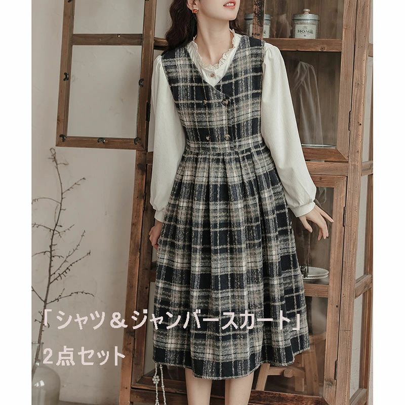 ジャンパースカートとシャツ2点セットアップ 学生服 制服風 フォーマスーツ 中学生 大学生 カジュアル 入学式 卒業式 黒 ミモレ丈ワンピース 長袖 シャツ 可愛い 森ガール系 白 Vネック スカート レディース 女子 文芸系 ゴスロリ ワンピース ブラック 謝恩会 お誕生日 12,936 ~