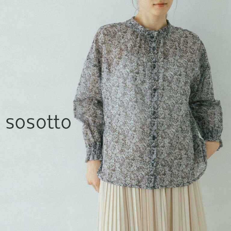 到着後レビューで、次回500円オフのクーポン! 詳しくはこちらより メーカー希望小売価格はメーカー商品タグに基づいて掲載していますsosotto ソソット ブラウス シャツ リバティ プリント スタンドカラー 前後 2WAY タック フリル 長袖 コットン ボイル 綿 100% 日本製 女性らしい清らかな美しさを表す「楚々」という言葉から付けられたsosotto(ソソット)。 ベーシックなアイテムの中に「清潔感のあるクリーンな女性らしさ」をプラスしたカジュアルスタイルを提案しています。 リバティプリント、前後2WAYのブラウスです。 ボタンがあるデザインとプルオーバー風、二通りの着方が楽しめる点が嬉しいですね。 フリルになったスタンドカラーと、襟下のギャザーが女性らしい印象。 また、袖口のゴムシャーリングもアクセントになっています。 袖をたくし上げても着れる点が◎ 肩の落ちるドロップショルダーで、ふんわりゆとりのあるシルエットです。 素材は、綿100%のコットン・ボイル。 ハリ感があり、サラッとした、少し透け感のある春夏らしい素材になっています。 リバティでは人気の柄CHIVEを、ソソットだけの別注でボイルにしています。 日本製の丁寧な作りも良いですね。 ・ブラウン(茶、黒、緑がかったグレーなど) ・ブルー(くすんだ青、濃紺、くすんだ緑など) ・ラベンダー(薄い紫、黒、くすんだ緑など)の3色 モデル:身長164cm フリルになったスタンドカラーと、襟下のギャザーが女性らしい印象。 袖口のゴムシャーリングもアクセントになっています。 ブラウン ブルー ラベンダー 商品説明 手洗いかドライクリーニング 裏地なし 日本製 サイズ サイズ:フリーサイズ 実寸、B134、着丈57、総丈63、肩幅65、袖丈43、アームホール21、裾幅64cm 素材 綿100% 【16%オフ・クーポン対象】sosotto ソソット ブラウス シャツ リバティ プリント スタンドカラー 前後 2WAY タック フリル 長袖 コットン ボイル 綿 100% 日本製 2026年春夏物 17,380 ~