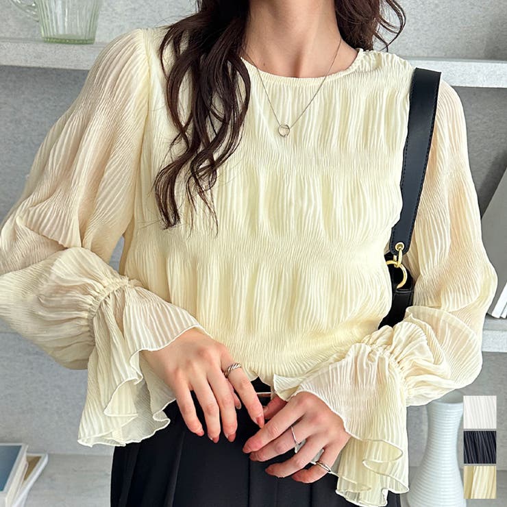 シャーリング風のプリーツデザインで華やかな印象にオンオフ問わず大活躍してくれる大人ブラウス〇通勤からお出かけまで幅広いシーンで活躍〇シャーリング風のプリーツ加工が特別感を演出〇ロングシーズン活躍するシフォン素材〇袖口はゴム仕様で腕まくりも楽々♪■デザイン繊細なシャーリング風のプリーツ加工が目を惹くブラウス。 袖口のキャンディスリーブデザインも華やかさをプラスしてくれます。 ウエストインでもアウトでもキマり、着回しの利く絶妙な丈感も秀逸!きちんと感のあるデザインなので、スーツスタイルのインナーとしても◎合わせるアイテム次第でデイリーにも通勤にもマッチするおススメの1枚です!-おすすめシーン-通勤、オフィスカジュアル、入学式、卒業式、セレモニー、フォーマル、オケージョン■素材上品なシアー感のある合繊素材身頃部分は裏地付で安心感も◎……………………透け感:あり厚さ:薄め伸縮性:なし裏地:あり(身頃部分のみ)洗濯方法:手洗い……………………■コーディネート今っぽいデニムやカーブパンツにウエストインしたきれいめカジュアルコーデがおススメ!ジャケットのインナーに着て、オフィススタイルをオシャレに格上するのも◎シンプルなキャミワンピースやジャンパースカートのインナーに着ても、今っぽい上品な着こなしに。 普段使いからオフィスシーンまで幅広く活躍してくれる優秀な1枚です!■ 品質/ポリエステル100%●裏地付(身頃のみ)■ サイズ(cm)/約M:バスト96、肩幅33、後着丈56、袖丈60L:バスト100、肩幅34、後着丈57、袖丈60.5LL:バスト104、肩幅35、後着丈58、袖丈61※商品によってシャーリングプリーツの出方が異なる場合があります。 ■ 取扱い/手洗い---------------------------------------------------------------------------------※サイズ寸法は実際の寸法と多少の誤差がある場合がございます。 ※ご覧いただいているPC/WEB環境や撮影環境により、 多少色味が異なって見える場合がございます。 【お買物をよりお楽しみいただく為に】▼商品のお気に入り登録をおすすめします♪『?をクリック!』完売カラーの再入荷などの通知を受ける事ができます。 ブランドのお気に入り登録もご一緒にお願いいたします。 ---------------------------------------------------------------------------------208980秋 秋服 冬 冬服 春 春服 オフィスカジュアル オフィス 韓国ファッション 韓国 プチプラ 10代 20代 30代 40代 50代 60代 レディース返品・交換について購入後の交換は受け付けておりません。 予めご了承ください。 返品を希望される場合は購入履歴一覧の「ショップへの問い合わせ」よりお問い合わせください。 =========================複数配送先指定について1件の注文に対して、異なる住所への配送は対応出来かねます。 恐れ入りますが、異なる住所へ配送をご希望の場合、配送先毎に分けて注文いただきますようお願い申し上げます。 【トップスWOMEN】ブラック オフホワイト アイボリー M L LLブラック オフホワイト アイボリー GeeRA シアーシャーリングキャンディー袖ブラウス トップス 2,499 ~