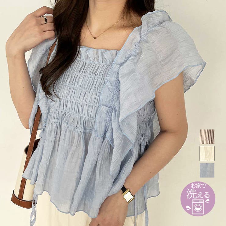 コーデに差がつく!ふんわりとした見た目が目を惹くフリルブラウス〇ふんわり広がるシルエットが女性らしい印象に〇計算されたデザインで華奢見えも叶えます◎〇涼しげな生地で着るだけで春夏らしいコーデに♪〇程よく甘く、程よくカジュアルなシアー素材を使用。 ■デザインシャーリングディティールを詰め込んだ華やかな主役級トップス。 大きめなフリルデザインで気になる二の腕もしっかりカバー◎ペプラムのようにふんわりと広がり、ウエスト位置を高く見せてくれて着痩せ効果も抜群です。 柔らかく程よく落ち感のあるシアー素材で軽やかな印象に。 肩を落としてオフショルとして着るのもおすすめ!フェミニンさを程よくミックスし、細部にまでこだわりを詰め込みました‥■素材さらっと肌触りが柔らかなシアー素材……………………透け感:ややあり厚さ:薄め伸縮性:なし裏地:なし洗濯方法:洗濯機……………………■コーディネートストレートデニムでスタイリッシュに、ワイドデニムやフレアデニムでゆるっとカジュアルなスタイリングとも相性抜群です◎■ 品質/ポリエステル44%、ナイロン35%、レーヨン20%、ポリウレタン1%■ サイズ(cm)/約M:バスト80、前身丈52、袖丈17L:バスト86、前身丈53、袖丈17※商品によって柄の出方が異なる場合があります。 ※淡色は透けやすいのでベージュ系インナーの着用をお勧めします。 ■ 取扱い/洗濯機---------------------------------------------------------------------------------※サイズ寸法は実際の寸法と多少の誤差がある場合がございます。 ※ご覧いただいているPC/WEB環境や撮影環境により、 多少色味が異なって見える場合がございます。 【お買物をよりお楽しみいただく為に】▼商品のお気に入り登録をおすすめします♪『?をクリック!』完売カラーの再入荷などの通知を受ける事ができます。 ブランドのお気に入り登録もご一緒にお願いいたします。 ---------------------------------------------------------------------------------返品・交換について購入後の交換は受け付けておりません。 予めご了承ください。 返品を希望される場合は購入履歴一覧の「ショップへの問い合わせ」よりお問い合わせください。 =========================複数配送先指定について1件の注文に対して、異なる住所への配送は対応出来かねます。 恐れ入りますが、異なる住所へ配送をご希望の場合、配送先毎に分けて注文いただきますようお願い申し上げます。 【トップスWOMEN】ブルー アイボリー ベージュ系ストライプ M Lブルー アイボリー ベージュ系ストライプ 【10%OFFクーポン!2/10(火)1:59まで】GeeRA 【nelliy.】フリルシャーリングブラウス トップス 2,999 ~