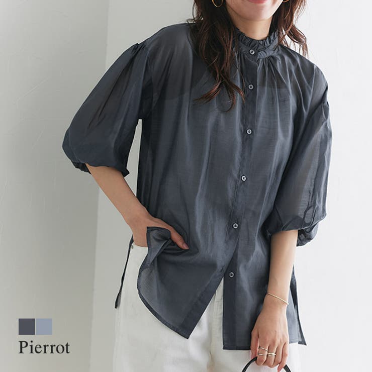 【10%OFFクーポン!2/10(火)1:59まで】Pierrot フリルネックシアーブラウス ☆ ブラウス シアー フリルネック レーヨン混 ボタン 羽織 体型カバー ピエロ トップス 3,861 ~