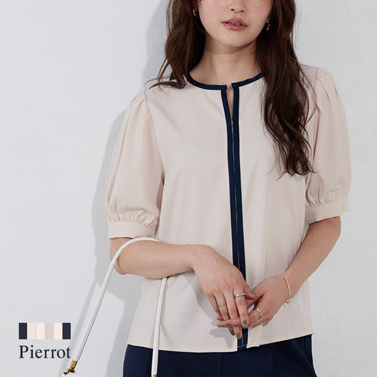【10%OFFクーポン!2/10(火)1:59まで】Pierrot 2way配色ボリューム袖ブラウス ☆ ブラウス 2way 配色 ボリューム袖 美シルエット ツヤ感 上品 オフィス 抜け感 すっきり 着映え ピエロ トップス 3,815 ~