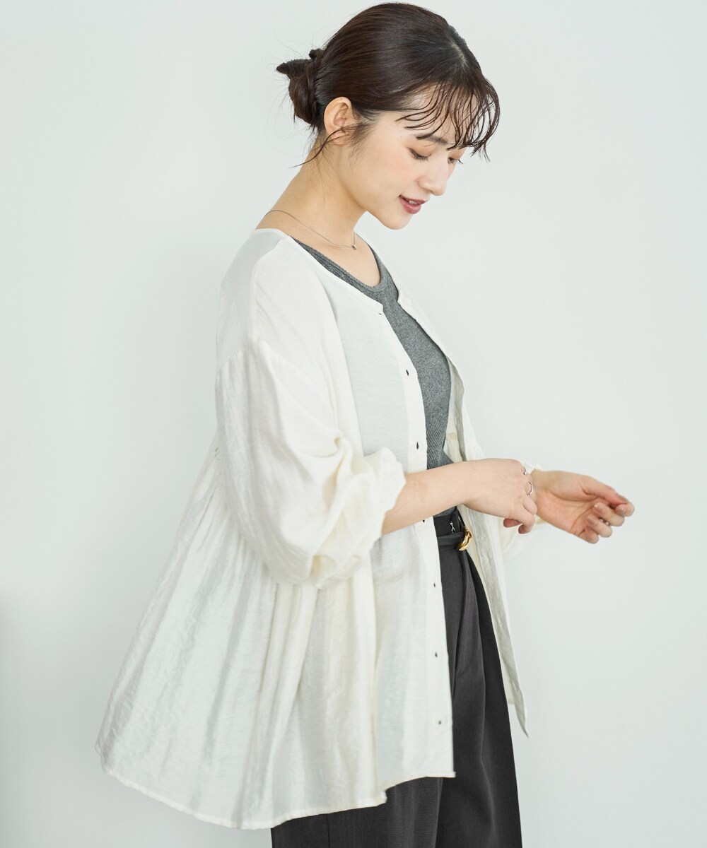 [型番:588068-73]milの名品!人気のチュニックブラウスに新色が加わり再登場♪ふんわりと広がるシルエットに、優しいニュアンスをまとったチュニックブラウス。 【デザイン】前後2wayで着られるだけでなく、ボタンを開ければライトな羽織としても活躍するマルチな一枚です。 胸下でギャザーを寄せたペプラム切替えデザインと、袖口のゴム仕様がほどよいメリハリをプラス。 ゆったりとしたシルエットでももたつかず、自然とバランスよく着こなせます。 定番カラーのブラック、アイボリーに、新色のグリーンとサックスが仲間入りした4色展開。 肌寒い季節は、ハイネックインナーやニットを仕込んだレイヤードスタイル。 春はシアーインナーとのレイヤードや、1枚でもさまになります。 暑い季節は軽めの羽織りとして、ロングシーズン頼れる万能アイテムです。 ーーーーーーーーーーーーーーーーー透け感:ややあり伸縮性:なし裏地 :なしーーーーーーーーーーーーーーーーー※総丈はサイドネックポイント(襟ぐりと肩線の交点)から測定しております。 【仕様】・前後2way仕様・ボタン前開き仕様■カラー:4色展開ONE SIZE/総丈(SNP〜裾)64cm、バスト104cm、肩幅48cm、袖丈51cm、アームホール22cm、袖口幅(ゴム上がり)10cm、天幅17cm、裾幅52cm※( )で表記されている数字はヌードサイズです。 ヌードサイズとは衣服を身につけない身体のサイズです。 お客様ご自身の身体サイズと比較してお選びください。 ■素材: 綿82% ナイロン18% ■お手入: 手洗い(水温30℃以下) >>商品のお取り扱い方法 ■原産国: 中国製【人気/再生産】前後 2WAY チュニック ブラウス 【mil (ミル)】/ミル(mil)001アイボリー061ライトグリーン072アッシュグレー画面上と実物では、多少色具合が異なって見える場合がございます。