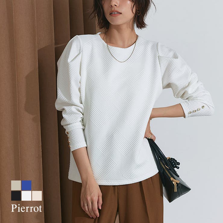 ジャカード映える袖デザイン“カットジャカードパフスリーブプルオーバー”立体感のある表情が魅力のジャカード素材に、ゴールドボタンで上品なアクセントをプラス。 肩周りにタックを寄せたパフスリーブが程よい華やかさを添え、ゴールドボタンが上品なアクセントに。 身頃はすっきりと無駄を省いたミニマル設計で、素材の表情が際立つ一枚に仕上げました。 前身頃は2枚仕立てで透けを気にせず着用いただけます。 ※商品画像は着用イメージです。 光や角度により、実物と色味が異なる場合がございます。 また表示のサイズ感も実物とは若干異なる場合もございますので、予めご了承ください。 【お買い物を楽しむための方法】**商品のお気に入り登録**カートボタン横のハートをクリック!気になるアイテムがお得になると通知が届きます。 チャンスをのがしません♪**ブランドのお気に入り登録**ブランドトップページの「お気に入りに追加」をクリック!新商品の情報を受け取ることができます。 【ブランド】Perrot(ピエロ)【スペック】■実寸(約cm)M:身丈60cm|肩幅34cm|バスト48cm|袖丈61cm|袖口幅10cm|脇口幅21cm|裾幅47cm|L:身丈62cm|肩幅36cm|バスト50cm|袖丈61cm|袖口幅10cm|脇口幅22cm|裾幅49cm|※実寸(平置きした状態でメジャー計測)の為、タグ表記のサイズとは異なります。 ■素材ポリエステル97%/ポリウレタン3%■洗濯表示液温は40℃を限度とし、ネットを使用し洗濯機で弱い洗濯ができる塩素系及び酸素系漂白剤の使用禁止タンブル乾燥禁止日陰のつり干しがよい底面温度120℃を限度としてアイロン仕上げができる(あて布使用)ドライクリーニング禁止■備考透け感(淡色):若干あり透け感(濃色):なし伸縮性:あり裏地:前身頃のみ二枚仕立てポケット:なしファスナー:なしオフホワイトとアイボリーは後ろ身頃部分に透け感が生じます。 ■ご注意・生地のカッティングにより画像と異なる場合がございます。 同商品、同色におきましても色(染料)やロットによって伸縮性・伸び率、裁断上ずれなどが生じてしまう現象があります。 また、プリント加工の際に、インク飛びが目立ってしまう場合がございますが、手法上致し方ない現象となりますので、なにとぞご了承くださいませ。 ・同生産時期でも、色、サイズ、デザイン、素材の質感が多少異なる場合がございます。 サイズ詳細などの測り方はスタッフ間で統一、徹底はしておりますが、若干の誤差(約2〜3cm誤差)がある場合がございます。 また、ニット製品は生産の過程上「生地を織る際の糸の継ぎ目」繊維の「混紡」、プレス加工、製品洗い加工によって形やサイズ(5cm前後)に誤差が生じる場合がございますが品質上の問題はございません。 返品・交換について購入後の交換は受け付けておりません。 予めご了承ください。 返品を希望される場合は購入履歴一覧の「ショップへの問い合わせ」よりお問い合わせください。 =========================複数配送先指定について1件の注文に対して、異なる住所への配送は対応出来かねます。 恐れ入りますが、異なる住所へ配送をご希望の場合、配送先毎に分けて注文いただきますようお願い申し上げます。 【トップスWOMEN】ブラック オフホワイト アイボリー グレージュ ブルー M Lブラック オフホワイト アイボリー グレージュ ブルー 【20%OFF!2/5(木)限定】Pierrot カットジャカードパフスリーブプルオーバー ☆ プルオーバー ジャカード パフ袖 ゴールドボタン 立体感 上品 タック パフスリーブ 華やか ミニマル ピエロ トップス 2,966 ~