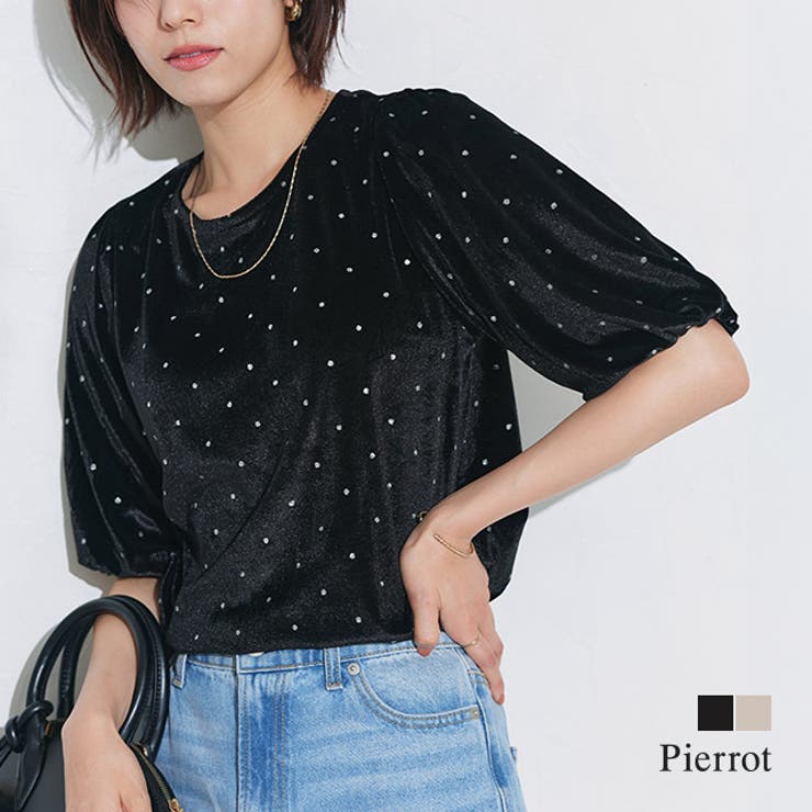 上品なきらめきが華やかさな印象に“ラメドットベロアトップス”シーズンムードを高めるベロア素材に、ラメのドットプリントを施した一枚。 ラメのきらめきがトレンド感をプラスし、装いに華やかさを添えてくれます。 素材と柄に存在感がある分、デザインはシンプルに。 どんなボトムスとも合わせやすいシルエットに仕上げました。 ふんわりとしたパフスリーブが程よく甘さを添え、女性らしい印象に。 デニムなどのカジュアルアイテムとも好相性で、スタイリング次第で幅広い着こなしを楽しめるアイテムです。 ※商品画像は着用イメージです。 光や角度により、実物と色味が異なる場合がございます。 また表示のサイズ感も実物とは若干異なる場合もございますので、予めご了承ください。 【お買い物を楽しむための方法】**商品のお気に入り登録**カートボタン横のハートをクリック!気になるアイテムがお得になると通知が届きます。 チャンスをのがしません♪**ブランドのお気に入り登録**ブランドトップページの「お気に入りに追加」をクリック!新商品の情報を受け取ることができます。 【ブランド】Perrot(ピエロ)【スペック】■実寸(約cm)M:身丈58cm|肩幅30cm|バスト44.5cm|袖丈34.5cm|袖口幅11cm|脇口幅21cm|裾幅52cm|L:身丈60cm|肩幅32cm|バスト46.5cm|袖丈34.5cm|袖口幅11cm|脇口幅22cm|裾幅54cm|※実寸(平置きした状態でメジャー計測)の為、タグ表記のサイズとは異なります。 ■素材ポリエステル100%■洗濯表示液温は40℃を限度とし、手洗いができる塩素系及び酸素系漂白剤の使用禁止タンブル乾燥禁止底面温度160℃を限度としてアイロン仕上げができる(あて布使用)石油系溶剤又はデカメチルペンタシクロシロキサンによるドライクリーニングができる■備考透け感(淡色):若干あり透け感(濃色):なし伸縮性:あり裏地:なしポケット:なしファスナー:なしライトベージュは若干透け感が生じます。 ■ご注意・生地のカッティングにより画像と異なる場合がございます。 同商品、同色におきましても色(染料)やロットによって伸縮性・伸び率、裁断上ずれなどが生じてしまう現象があります。 また、プリント加工の際に、インク飛びが目立ってしまう場合がございますが、手法上致し方ない現象となりますので、なにとぞご了承くださいませ。 ・同生産時期でも、色、サイズ、デザイン、素材の質感が多少異なる場合がございます。 サイズ詳細などの測り方はスタッフ間で統一、徹底はしておりますが、若干の誤差(約2〜3cm誤差)がある場合がございます。 また、ニット製品は生産の過程上「生地を織る際の糸の継ぎ目」繊維の「混紡」、プレス加工、製品洗い加工によって形やサイズ(5cm前後)に誤差が生じる場合がございますが品質上の問題はございません。 返品・交換について購入後の交換は受け付けておりません。 予めご了承ください。 返品を希望される場合は購入履歴一覧の「ショップへの問い合わせ」よりお問い合わせください。 =========================複数配送先指定について1件の注文に対して、異なる住所への配送は対応出来かねます。 恐れ入りますが、異なる住所へ配送をご希望の場合、配送先毎に分けて注文いただきますようお願い申し上げます。 【トップスWOMEN】ブラック ライトベージュ M Lブラック ライトベージュ 【20%OFF!2/5(木)限定】Pierrot ラメドットベロアトップス ☆ ラメ ベロア ドット トップス 華やか トレンド パフスリーブ 女性らしい 着回し ピエロ トップス 3,561 ~