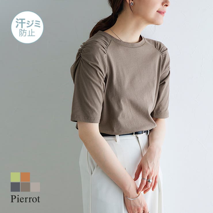 快適な着心地で女性らしさを引き立てる“汗ジミ防止シャーリングデザインTシャツ”肌触りの良いさらっとした風合いのコットン素材を使用。 表面には撥水加工、裏面には吸水速乾加工を施すことで水分をしっかり吸収しながらも表面では目立たない状態に。 汗が気になる季節に最適のアイテムです。 袖にシャーリングを施すことで丸みのあるデザイン袖に仕上げ、ブラウス見えするデザインTシャツ。 甘くなりすぎず、程良くトレンド感を加えてくれるところも嬉しいポイント。 ボトムを選ばず着回しやすい一枚です。 ※商品画像は着用イメージです。 光や角度により、実物と色味が異なる場合がございます。 また表示のサイズ感も実物とは若干異なる場合もございますので、予めご了承ください。 【お買い物を楽しむための方法】**商品のお気に入り登録**カートボタン横のハートをクリック!気になるアイテムがお得になると通知が届きます。 チャンスをのがしません♪**ブランドのお気に入り登録**ブランドトップページの「お気に入りに追加」をクリック!新商品の情報を受け取ることができます。 【ブランド】Pierrot(ピエロ)【スペック】■サイズ M/L■実寸(約cm)【身丈/裄丈/バスト/袖口幅/脇口幅/裾幅】M:59/44/45/13.5/27/48L:60/45/47/13.5/28/50※実寸(平置きした状態でメジャー計測)の為、タグ表記のサイズとは異なります。 ■素材綿100%■洗濯表示液温は30℃を限度とし、ネットを使用し洗濯機で非常に弱い洗濯処理ができる塩素系及び酸素系漂白剤の使用禁止タンブル乾燥禁止日陰のつり干しがよい底面温度110℃を限度としてアイロン仕上げができる(あて布使用)ドライクリーニング禁止ウェットクリーニング禁止■備考透け感:なし伸縮性:あり裏地:なしポケット:なし生地の特性上少し毛羽たちが生じます。 ※加工は永久ではなく洗濯ごとに薄れていきます。 ■ご注意・生地のカッティングにより画像と異なる場合がございます。 同商品、同色におきましても色(染料)やロットによって伸縮性・伸び率、裁断上ずれなどが生じてしまう現象があります。 また、プリント加工の際に、インク飛びが目立ってしまう場合がございますが、手法上致し方ない現象となりますので、なにとぞご了承くださいませ。 ・同生産時期でも、色、サイズ、デザイン、素材の質感が多少異なる場合がございます。 サイズ詳細などの測り方はスタッフ間で統一、徹底はしておりますが、若干の誤差(約2〜3cm誤差)がある場合がございます。 また、ニット製品は生産の過程上「生地を織る際の糸の継ぎ目」繊維の「混紡」、プレス加工、製品洗い加工によって形やサイズ(5cm前後)に誤差が生じる場合がございますが品質上の問題はございません。 返品・交換について購入後の交換は受け付けておりません。 予めご了承ください。 返品を希望される場合は購入履歴一覧の「ショップへの問い合わせ」よりお問い合わせください。 =========================複数配送先指定について1件の注文に対して、異なる住所への配送は対応出来かねます。 恐れ入りますが、異なる住所へ配送をご希望の場合、配送先毎に分けて注文いただきますようお願い申し上げます。 【トップスWOMEN】チャコール モカ グレージュ ピスタチオ オレンジ M L 【10%OFFクーポン!2/10(火)1:59まで】Pierrot Steady 8月号掲載アイテム 汗ジミ防止シャーリングデザインTシャツ ☆ Tシャツ 汗ジミ防止 シャーリング デザインTシャツ 綿100% コットン100% さらさら モカ フェミニ 1,751 ~