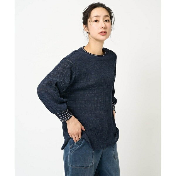 [型番:PZKGB38210]甘過ぎずテイストレスに着回せるシアーカットソー■デザイン・表面感のあるシャーリング素材は1枚着として着映えするプルオーバーです・襟と袖口には同色のニット編立を使用しタックアップもスムーズにしていただけます・コーディネートのアクセントになる襟と袖の細ラインボーダー柄もポイント・前後差のある着丈で気になるヒップラインをカバーしてくれるところもポイントです・やや透け感のある素材なのでタンクトップやキャミソールなどで透け感を調整してお楽しみいただけるアイテムです・薄手の生地なのでインでもアウトでもバランス良くコーディネートしていただけます・同シリーズの半袖カットソー[PZKHA64210]もご用意しております。 ■素材・特殊な編み機を使用することでシャーリング加工を施し、ほどよい光沢感とカジュアル感をブレンドしたランダムシャーリングレース・リサイクルポリエステルを使用することで環境にも配慮しています・伸縮性もあるので快適な着心地です■関連特集・見た目も着心地も” 涼 ” / シアーアイテムをPICK UP!・今着れて初夏も使えるTOPS集めました!・<シーン別>GWお出かけコーディネートサンプル**********************透け感:ややあり裏地:なし伸縮性:あり光沢感:なし生地の厚さ:薄手ケア方法:手洗い ********************** model:H169 B78 W60 H89 着用サイズ:M※【スモーキーグリーン】はWEB限定カラーになります。 ※自然光・照明の関係、パソコン・スマートフォンなどの環境により、実際と色味が違って見える場合がございます。 予めご了承ください。 商品の色味は、詳細画像をご参照ください。 ■カラー:スモーキーグリーン、ネイビー、ホワイト、ブラックM:着丈65 身幅54.2 肩幅50 袖丈45.5 裄丈70.5 袖口18 裾周り110※( )で表記されている数字はヌードサイズです。 ヌードサイズとは衣服を身につけない身体のサイズです。 お客様ご自身の身体サイズと比較してお選びください。 ■素材: スモーキーグリーン/ネイビー/ホワイト/ブラック:本体部分 ポリエステル 99% ポリウレタン 1% ニット部分 ポリエステル 98% ポリウレタン 2% ■お手入: >>商品のお取り扱い方法 ■原産国: 中国ランダムシャーリングカットソー/ジョルジュ・レッシュ(GEORGES RECH)スモーキーグリーンネイビーホワイトブラック画面上と実物では、多少色具合が異なって見える場合がございます。