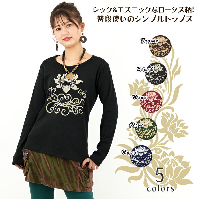 ロータスプリントプルオーバー トップス カットソー シャツ Tシャツ ブラウス ラウンドネック 丸首 長袖 お出かけ カジュアル ストレッチ 蓮 コットン 綿 大人 全5色 1,950 ~