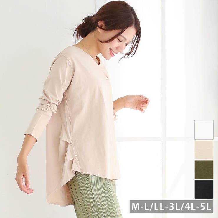 脇タックVネック長袖カットソーゆったり着られるラウンド裾。 Vネックでデコルテを綺麗に見せます。 【サイズ】[M-Lサイズ]着丈(front/back):65cm/74cm、肩幅:40cm、身幅:56cm、裾幅:71cm、袖ぐり:20cm、袖丈:52cm、袖幅:17cm、袖口幅:10cm[LL-3Lサイズ]着丈(front/back):66.5cm/75.5cm、肩幅:41.5cm、身幅:61cm、裾幅:76cm、袖ぐり:22cm、袖丈:52cm、袖幅:19cm、袖口幅:11cm[4L-5Lサイズ]着丈(front/back):68cm/77cm、肩幅:43cm、身幅:66cm、裾幅:81cm、袖ぐり:25cm、袖丈:52cm、袖幅:22cm、袖口幅:12cm◆モデル身長:162cm M-Lサイズ着用【素材】コットン100%【裏地】なし【透け感】淡色によっては若干あり【伸縮性】若干あり【生地の厚さ】薄い【原産国】バングラデシュ≪注意事項≫・撮影時のライティング、ご覧になっているモニター・PC環境によって実際の商品とは異なって見える場合がございます。 何卒ご注意の上ご購入ください。 ・サイズは若干の誤差が生じる場合がございます。 返品・交換について購入後の交換は受け付けておりません。 予めご了承ください。 返品を希望される場合は購入履歴一覧の「ショップへの問い合わせ」よりお問い合わせください。 =========================複数配送先指定について1件の注文に対して、異なる住所への配送は対応出来かねます。 恐れ入りますが、異なる住所へ配送をご希望の場合、配送先毎に分けて注文いただきますようお願い申し上げます。 【トップスWOMEN】ブラック カーキ ライトベージュ オフホワイト M-L LL-3L 4L-5L 【10%OFFクーポン!2/10(火)1:59まで】JungleJalopy 【M-L・LL-3L・4L-5L】脇タックVネック長袖カットソー トップス 2,295 ~