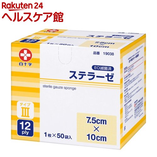 お店TOP>衛生医療>看護・医療用品>ガーゼ類>医療ガーゼタイプIII>白十字 ステラーゼ 7.5cm*10cm 滅菌済 タイプIII 12折 (50袋入*3箱セット)お一人様50セットまで。 商品区分:一般医療機器(届出番号:13B2X00023000011)【白十字 ステラーゼ 7.5cm*10cm 滅菌済 タイプIII 12折の商品詳細】●タイプIII 12折の医療用ガーゼです。 ●1枚ずつ個包装、滅菌されているので傷口にも安心です。 ●滅菌個包装から取り出し、すぐにお使い頂けます。 ●傷口以外にも、眼帯・マスクのあてガーゼなど幅広くご使用頂けます。 【使用方法】本品を無菌的に滅菌袋より取り出し、そのまま直ちに、1 回限り使用してください。 【白十字 ステラーゼ 7.5cm*10cm 滅菌済 タイプIII 12折の原材料】綿100%【規格概要】品名・名称:医療ガーゼタイプIII12折サイズ:7.5cm*10cm滅菌済【注意事項】・再使用禁止。 ・再滅菌禁止。 ・体内に残らないように使用してください。 ・包装が開封、破損、水濡れ及び他の汚染がみられる場合は滅菌品として使用しないでください。 ・一度開封したものは、滅菌状態が保てないので、開封後全量を消費してください。 ・直射日光及び火気を避け、湿気の少ない清潔な場所に保管してください。 ・小児の手の届かないところに保管してください。 【原産国】中国【ブランド】白十字【発売元、製造元、輸入元又は販売元】白十字※説明文は単品の内容です。 ※より多くの方に購入いただくために、複数回注文いただいた場合はキャンセルさせていただくことがございます。 リニューアルに伴い、パッケージ・内容等予告なく変更する場合がございます。 予めご了承ください。 ・単品JAN:4987603190382白十字171-8552 東京都豊島区高田3-23-120120-01-8910広告文責:楽天グループ株式会社電話:050-5577-5042[衛生用品/ブランド:白十字/] 白十字 ステラーゼ 7.5cm*10cm 滅菌済 タイプIII 12折(50袋入*3箱セット)【白十字】 4,118 ~