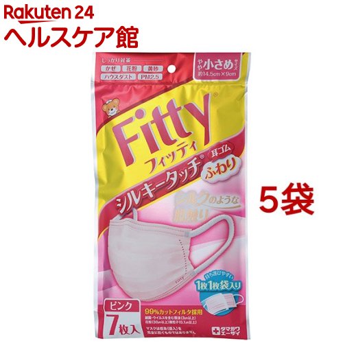 お店TOP>衛生医療>マスク>マスク全部>使い捨てマスク>フィッティ シルキータッチ 耳ゴムふわり やや小さめサイズ ピンク (7枚入*5袋セット)【フィッティ シルキータッチ 耳ゴムふわり やや小さめサイズ ピンクの商品詳細】●シルクのような肌触り。 ●ノーズフィッターで顔のラインにフィット。 ●立体プリーツ加工で不快な息苦しさを解消。 ●1枚1枚袋入りで持ち運びに便利。 ●3層構造で花粉・ホコリをしっかりガード。 ●耳にやさしい幅広ふわふわゴム。 【使用方法】(1)表と裏を確認します。 耳かけゴムが接着されている面が外側(顔に触れない面)です。 (2)ノーズフィッターを鼻の形に合わせます。 (3)顔にフィットさせながら、耳かけゴムを掛けます。 (4)顔の大きさに合わせてプリーツを上下に広げます。 【フィッティ シルキータッチ 耳ゴムふわり やや小さめサイズ ピンクの原材料】・本体・フィルタ部:ポリプロピレン、ポリエチレン・耳ひも部:ナイロン、ポリエステル、ポリウレタン・ノーズフィッター部:ポリエチレン【規格概要】・サイズ:約14.5cm*9cm・カラー:本体(ピンク)/耳ひも部(白)・対象:風邪・花粉・ほこり等【注意事項】★使用上の注意・本品は有害な粉塵やガス等が発生する場所でのご使用や、それを防ぐ目的には使用できません。 ・肌に異常がある場合や、かゆみ・かぶれ・発疹等の症状があらわれた時は、ただちに使用を中止し医師にご相談ください。 ・においで気分が悪くなった場合には、ご使用を中止してください。 ・マスク上部にノーズフィッターがついてますので、取り扱いにご注意ください。 ・使いきりマスクのため洗濯などによる再使用はできません。 ・火気のそばでのご使用はおやめください。 ・不織布の製造上ごく稀に色ムラが出ることがありますが性能に変わりはありません。 ・個人差等により、メガネが曇る場合がありますので運転の際などは十分にご注意ください。 ・衛生面・機能面から、1日1枚のご使用をおすすめします。 ・個別包装の印刷が、まれに色移りをおこす場合があります。 ★保管上の注意・湿気のない清潔な所に保管してください。 ・乳幼児の手の届かないところに保管してください。 【原産国】中国【ブランド】フィッティ【発売元、製造元、輸入元又は販売元】玉川衛材※説明文は単品の内容です。 リニューアルに伴い、パッケージ・内容等予告なく変更する場合がございます。 予めご了承ください。 ・単品JAN:4901957215355玉川衛材東京都千代田区富士見1-8-19住友不動産富士見ビル14階03-4334-8857 広告文責:楽天グループ株式会社電話:050-5577-5043[マスク/ブランド:フィッティ/] フィッティ シルキータッチ 耳ゴムふわり やや小さめサイズ ピンク(7枚入*5袋セット)【フィッティ】 1,078 ~