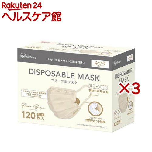 お店TOP>衛生医療>マスク>マスク 形状・素材別>プリーツマスク>プリーツマスク アイリスオーヤマ ペールベージュ カラーマスク (120枚入×3セット)【プリーツマスク アイリスオーヤマ ペールベージュ カラーマスクの商品詳細】●花粉・ウイルス飛沫等を99%カットするフィルターを採用しています。 ●側面両端Vカット加工しているので、ほほとのすき間を低減し、長時間ぴったりフィットします。 ●耳にやさしいやわらか丸耳ひも採用で耳が痛くなりにくいです。 ●ダブルΩプリーツ加工で口元空間をキープするから会話が楽です。 【使用方法】(1)プリーツを伸ばし、マスクが立体になるように広げます。 (2)マスクを顔に当てて、ノーズフィッターを鼻の形に合わせます。 (3)マスクをおさえた状態で耳紐を掛けます。 【規格概要】ふつうサイズ:120枚×1箱セット商品サイズ(cm):幅約16.5×高さ約9主要材質本体・フィルター:ポリプロピレン耳ひも:ポリウレタン、ポリエステルノーズフィッター:ポリエチレン【発売元、製造元、輸入元又は販売元】アイリスプラザ※説明文は単品の内容です。 リニューアルに伴い、パッケージ・内容等予告なく変更する場合がございます。 予めご了承ください。 ・単品JAN:4967576734479アイリスプラザ980-0021 宮城県仙台市青葉区中央2-1-703-6704-9391広告文責:楽天グループ株式会社電話:050-5577-5043[マスク] プリーツマスク アイリスオーヤマ ペールベージュ カラーマスク(120枚入×3セット) 2,939 ~