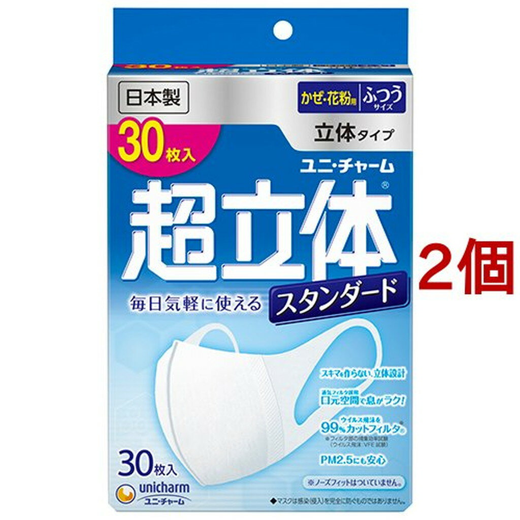 【商品名】 超立体マスク かぜ・花粉用 (ノーズフィット付き) 小さめサイズ 【このような場合に】 【対象】 風邪・花粉・PM2.5 【製造販売会社】 ユニ・チャーム(unicharm) 【ご使用について】 【使用方法】 (1)マスクの上下を確認し、マスクを左右に広げます。 (2)耳かけを引っ張りながら、マスクを耳にかけます。 (3)「ノーズフィット」を鼻の形に合わせてフィットさせます。 ・機能性の維持、衛生面から、1日1枚のご使用をお勧めします。 ・お子様には、保護者の方から使用方法等をご説明ください。 【注意事項】 ・個人差により、眼鏡が曇る場合がありますので、運転の際などは十分にご注意ください。 ・本品は使いきり商品です。 洗濯による再使用はできません。 ・耳かけを引っ張りすぎると、ゆるくなることがあります。 ・本品は有害な粉塵やガス等の発生する場所でのご使用はできません。 ・肌に異常がある場合は、使用しないでください。 ・万一、肌にかゆみ・かぶれ・しめつけや擦れによる異常があらわれた場合は、直ちにご使用をやめ、医師にご相談ください。 ・万一、臭いにより気分が悪くなった場合は、ご使用をおやめください。 ・お子様の睡眠時のご使用は、安全性を考慮し、お控えください。 ・乳幼児の手の届かない所に保管してください。 ・高温多湿な場所、直射日光の当たる場所での保管は避けてください。 ・火気のそばでのご使用はおやめください。 【素材】 ●本体・フィルタ部 …ポリオレフィン、ポリエステル ●耳かけ部 …ポリオレフィン、ポリウレタン ●ノーズフィット部 …ポリオレフィン 製品の特徴 ●ユニ・チャーム 超立体マスク かぜ・花粉用 立体タイプ ●スキマを作らず、強力遮断。 ●99%ウイルス飛沫カットフィルタ※でブロック! …0.1μm?1.0μmまで小さな微粒子や、ウイルス飛沫をしっかりブロック。 ※フィルタ部の捕集効率試験 平均値(微粒子:PFE試験/ウイルス飛沫:VFE試験) ●全面フィット形状で「スキマなし」! …超立体構造でぴったりフィットして、どこにもスキマを作らない。 ●やわらかストレッチ耳かけ! …耳に負担をかけない形状設計で、しっかりフィットするのに長時間痛くない。 ●息ラク感アップ通気フィルタ。 …口にはりつかない立体構造と、通気フィルタ採用で、息ラク感アップ。 ●かぜ・花粉用。 PM2.5にも安心。 ※マスクは感染(侵入)を完全に防ぐものではありません。 ●日本製 ●ワイド耳かけ ●カラー:ホワイト(白色) ●小さめサイズ(H128mm×W66mm)※2つ折り時 【送料無料!(地域限定)】超立体マスク かぜ・花粉用 (ノーズフィット付き) 小さめサイズ 30枚 2個セット 3,071 ~