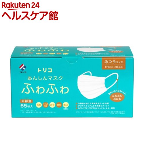 お店TOP>衛生医療>マスク>マスク 形状・素材別>不織布マスク>トリコ あんしんマスクふわふわ ふつうサイズ (65枚入*3箱セット)【トリコ あんしんマスクふわふわ ふつうサイズの商品詳細】●丸ゴムのふわふわ耳ひも採用。 長時間装着していても耳が痛くなりにくい。 ●BFE、VFE、PFE99%カットフィルター採用。 花粉、ウィルス飛沫、黄砂、ほこり対策に。 ●口側は吸水加工不織布を採用。 長時間さらっと快適さを保ちます。 ●ダブルステッチ入りでお顔にピッタリフィット。 ●お菓子風の違和感なくインテリア映えする可愛いデザイン。 【使用方法】・マスクは感染(侵入)を完全に防ぐものではありません。 ・フィルターの性能を十分に発揮させるためにマスクは正しくつけてください。 (1)ノーズフィットワイヤーを上にし、耳ひもがついている面が内側(顔側)になるようにご使用ください。 (2)ノーズフィットワイヤーを鼻の形に合わせて耳ひもをかけます。 (3)鼻、口、あごを覆うようにプリーツを上下に広げ、顔にフィットさせてください。 【規格概要】本体:ポリプロピレン不織布耳ひも:ポリエステル、ポリウレタンノーズフィットワイヤー:ポリエチレン本体サイズ:約175mm*95mm枚数:65枚入り【注意事項】・本品は有害ガス、有害粉塵を防ぐ目的では使用できません。 ・火気のそばで使用しないでください。 ・マスクが触れる部分に傷や炎症がある場合は使用しないでください。 ・不織布特有のにおいなどで気分が悪くなった場合は、使用を中止してください。 ・万一、かゆみ、かぶれ等の症状があらわれた場合には使用を中止し、医師にご相談してください。 ・乳幼児の手の届かない場所に保管してください。 ・高温多湿を避けて保管してください。 ※本品は使いすてマスクです。 洗濯による再使用はできません。 【原産国】中国【発売元、製造元、輸入元又は販売元】トリコ※説明文は単品の内容です。 リニューアルに伴い、パッケージ・内容等予告なく変更する場合がございます。 予めご了承ください。 ・単品JAN:4573504711094トリコ東京都渋谷区渋谷1-20-1 井門美竹ビル2F03-6452-6554広告文責:楽天グループ株式会社電話:050-5577-5043[マスク] トリコ あんしんマスクふわふわ ふつうサイズ(65枚入*3箱セット) 1,784 ~