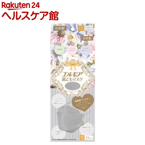 お店TOP>衛生医療>マスク>マスク全部>マスク全部>エルモア 肌ともマスク Flower グレー 個別包装 (24枚入*3箱セット)【エルモア 肌ともマスク Flower グレー 個別包装の商品詳細】●VFE・PFE・BFE99%カットの高密度フィルター採用。 ●花粉・ウイルス飛まつ・細菌飛まつ・PM2.5等をしっかりガード!●呼吸がしやすく、メイクが付きにくい立体構造。 ●マチが上部と下部に分かれた立体構造で高密着。 美しいフェイスラインを演出し、小顔効果も期待できます。 ●伸縮性のあるソフトゴムの耳ひもと、ノーズ部の山形カットライン&ノーズフィッターで肌によりフィット。 ●クールなイメージのグレーのカラーマスク。 ●便利で衛生的な個別包装パッケージ●日本製【規格概要】マスクサイズ:約20*8cm素材:本体・フィルター/ポリオレフィン、ノーズフィッター部/ポリオレフィン、耳ひも部/ポリオレフィン【注意事項】※マスクは感染を完全に防ぐものではありません。 【原産国】日本【ブランド】エルモア【発売元、製造元、輸入元又は販売元】カミ商事※説明文は単品の内容です。 リニューアルに伴い、パッケージ・内容等予告なく変更する場合がございます。 予めご了承ください。 ・単品JAN:4971633910287カミ商事愛媛県四国中央市三島宮川1-2-270896ー24-5316広告文責:楽天グループ株式会社電話:050-5577-5043[マスク/ブランド:エルモア/] エルモア 肌ともマスク Flower グレー 個別包装(24枚入*3箱セット)【エルモア】 3,008 ~