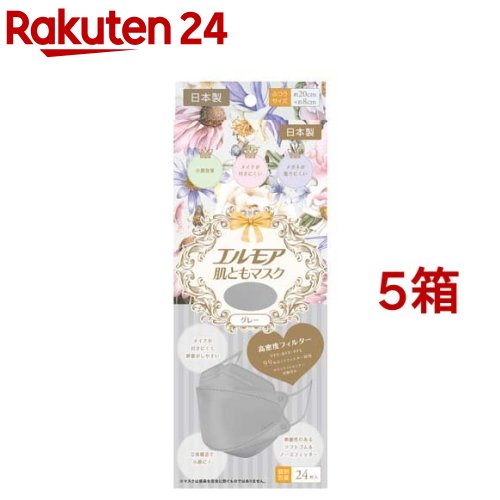 お店TOP>衛生医療>マスク>マスク全部>マスク全部>エルモア 肌ともマスク Flower グレー 個別包装 (24枚入*5箱セット)【エルモア 肌ともマスク Flower グレー 個別包装の商品詳細】●VFE・PFE・BFE99%カットの高密度フィルター採用。 ●花粉・ウイルス飛まつ・細菌飛まつ・PM2.5等をしっかりガード!●呼吸がしやすく、メイクが付きにくい立体構造。 ●マチが上部と下部に分かれた立体構造で高密着。 美しいフェイスラインを演出し、小顔効果も期待できます。 ●伸縮性のあるソフトゴムの耳ひもと、ノーズ部の山形カットライン&ノーズフィッターで肌によりフィット。 ●クールなイメージのグレーのカラーマスク。 ●便利で衛生的な個別包装パッケージ●日本製【規格概要】マスクサイズ:約20*8cm素材:本体・フィルター/ポリオレフィン、ノーズフィッター部/ポリオレフィン、耳ひも部/ポリオレフィン【注意事項】※マスクは感染を完全に防ぐものではありません。 【原産国】日本【ブランド】エルモア【発売元、製造元、輸入元又は販売元】カミ商事※説明文は単品の内容です。 リニューアルに伴い、パッケージ・内容等予告なく変更する場合がございます。 予めご了承ください。 ・単品JAN:4971633910287カミ商事愛媛県四国中央市三島宮川1-2-270896ー24-5316広告文責:楽天グループ株式会社電話:050-5577-5042[マスク/ブランド:エルモア/] エルモア 肌ともマスク Flower グレー 個別包装(24枚入*5箱セット)【エルモア】 4,973 ~
