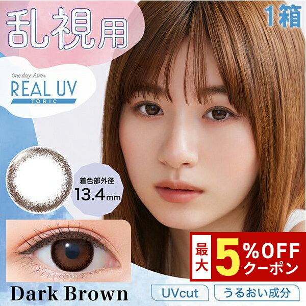 ★☆ワンデーアイレリアルUVトーリック ☆★ 1day×Toric×Circle 変わるも 変わらないも 選ぶのは自分 乱視があるとカラーが選べない、 といった声にお応えして生まれた、日本初の乱視用1日使い捨てサークルレンズ。 乱視の方も安心して、気軽にサークルレンズを楽しめます。 商品詳細 含水率 42.5% DIA 14.2mm BC 8.6mm PWR(度数) ±0.00, -0.50〜-6.00(-0.25ステップ) (-0.50, -0.75, -1.00, -1.25, -1.50, -1.75, -2.00, -2.25, -2.50, -2.75, -3.00, -3.25, -3.50, -3.75, -4.00, -4.25, -4.50, -4.75, -5.00, -5.25, -5.50, -5.75, -6.00) -6.50〜-8.00(-0.50ステップ) (-6.50, -7.00, -7.50, -8.00) CYL(乱視度数) -0.75/-1.25 AX(乱視軸度) 90°(CYL-0.75のみ)/180° 着色直径 [13.0mm]ブラウン [13.4mm]ダークブラウン カラー ダークブラウン・ブラウン 区分/使用目的 高度管理医療機器/視力補正用色付レンズ(終日装用・1日使い捨て) 医療用具承認番号 22600BZX00273000 製造国 台湾 輸入販売元 株式会社アイレ 広告文責 株式会社ワッツ TEL:042-512-7228 ※コンタクトレンズを安全にお使いいただく為、 また、眼の健康の為にも、必ず定期的に医師の検査をお受けください。 ※1回のご購入につき、お一人様がおおよそ1年分使用する分までとさせていただきます。 こちらの商品は「乱視用」レンズです。 近視用レンズはこちら↓ 他の箱数はこちら↓ 1箱 6箱セット 他のカラーはこちら↓ ダークブラウン1箱 送料無料[2箱][乱視用]ワンデーアイレリアルUVトーリック 2箱セット 1箱10枚入り 1日使い捨て 乱視 UVカット 度あり 度なし どあり どなし カラコン 1day Aire Real Toric 白宮みずほ カラーコンタクト ネオサイト アイレ DIA14.2mm 4,372 ~