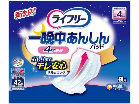 お店TOP>介護>おむつ・失禁対策・トイレ用品>尿とりパッド>尿とりパッド テープ用>ライフリー 一晩中あんしん 尿とりパッド 4回吸収 (42枚入)【ライフリー 一晩中あんしん 尿とりパッド 4回吸収の商品詳細】●横モレ安心立体ギャザーで寝姿勢でもモレずに一晩中安心できる尿とりパッドです。●(1)横モレ安心立体ギャザーがすきまをつくらずフィットして横モレを防ぐ。●(2)安心の55cm大判サイズ。●(3)吸引スポットが尿を素早く下層に引き込みスピード吸収。●(4)通気性バックシート採用で、おむつ内部の湿気を外に逃がすのでムレにくい。【使用方法】ご使用前に必ずお読みください。別売りの「テープ止めタイプ紙おむつ」と一緒に使います。テープ止めタイプ紙おむつ専用の「尿とりパッド」です。1.尿とりパッドの前後を確認します。2.おむつの中心が背骨にくるように敷き、おむつのギャザーの内側に収まるように尿とりパッドを重ねます。3.体を仰向けにし、尿とりパッドを体にフィットさせながら引き上げて、尿とりパッドの前方を広げます。4.おむつを体の中心に合わせ、足ぐりに隙間ができないようにおむつを引き上げます。5.下のテープは水平もしくは上向きに、上のテープは下向きにとめます。【規格概要】(素材)表面材・・・ポリオレフィン不織布/吸水材・・・綿状パルプ、吸水紙、高分子吸水材/防水材・・・ポリオレフィンフィルム/伸縮材・・・ポリウレタン/結合材・・・スチレン系エラストマー合成樹脂(外装材)ポリエチレン【注意事項】・汚れたパッドは早くとりかえてください。・誤って口に入れたり、のどにつまらせることのないよう、保管場所に注意し、使用後はすぐに処理してください。【原産国】日本【ブランド】ライフリー 重度高機能パッド【発売元、製造元、輸入元又は販売元】ユニ・チャーム商品に関するお電話でのお問合せは、下記までお願いいたします。受付時間9:30-17:00(月-金曜日、祝日除く)ベビー用品:0120-192-862生理用品:0120-423-001軽失禁・介護用品(ライフリー):0120-041-062生活用品(化粧パフ・一般ウェットティッシュ・お掃除用品など):0120-573-001衛生用品(マスク):0120-011-529ペットケア用品:0120-810-539リニューアルに伴い、パッケージ・内容等予告なく変更する場合がございます。予めご了承ください。ユニ・チャーム東京都港区三田3-5-19住友不動産三田ガーデンタワー広告文責:楽天グループ株式会社電話:050-5577-5042[大人用紙おむつ 失禁用品/ブランド:ライフリー 重度高機能パッド/] ライフリー 一晩中あんしん 尿とりパッド 4回吸収(42枚入)【ライフリー 重度高機能パッド】 1,900 ~