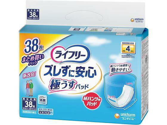 ↑↑↑正確な在庫状況は上記バナー「在庫状況を確認する」をクリックして頂き、必ずご確認ください。 パッと広がりピタッとくっつく紙パンツ用パッド。●紙パンツ用パッドならズレ止めテープが紙パンツにピタッとくっつくので、ご本人でも簡単に交換できる!(1)紙パンツの中にキレイに収まる長さ・幅専用形状なので、ぴったりフィットしモレ安心。(2)前後のズレ止めテープが紙パンツにぴったりくっついて、上げ下げしてもズレない。(3)二つ折り形状なので、ご本人でも簡単に装着できる。●内容量:38枚、●成分:[素材]表面材:ポリオレフィン、ポリエステル不織布/吸水材:綿状パルプ、吸水紙、高分子吸水材/防水材:ポリオレフィンフィルム/止着材:ポリオレフィン系合成樹脂/伸縮材:ポリウレタン/結合材:スチレン系エラストマー合成樹脂 [外装材]ポリエチレン医療費控除対象品生産国:日本商品区分:なしメーカー:ユニ・チャーム※メーカーの都合により、パッケージ・仕様等は予告なく変更になる場合がございます。 ユニ・チャーム(unicharm) ライフリー ズレずに安心 紙パンツ用パッド 極うす 4回 38枚 3,234 ~