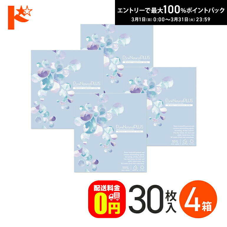 ※左右2箱ずつ、計4箱のお届けとなります。 Pure Natural PLUS 1day (1)紫外線カット 様々なトラブルの原因となる紫外線をカットする成分を配合。 (2)うるおい成分配合 保存液にヒアルロン酸の約2倍の保水力を持つMPCポリマーを配合。 (3)薄型のエッジデザイン 厚みを抑えることで異物感を軽減。 (4)高含水レンズ 水分を多く含むため、目の負担が少ないやさしいレンズ。 (5)優れた装用感 素材がやわらかいので目になじみやすい。 交換時期 1日交換型(ワンデータイプ) 商品名 Pure Natural PLUS 55%(ピュアナチュラルプラス55%) 販売名 ピュアナチュラル55UVM 容量 30枚入り スペック BC(ベースカーブ): 8.70 P(度数): -0.50〜-6.00(0.25ステップ)、 -6.50〜-10.00(0.50ステップ) DIA(サイズ): 14.2mm 含水率 55% 医療機器承認番号 22900BZX00392A10 製造販売元 粧美堂様々なセットをご用意致しました。 ご使用頻度や、ご予算によってお好みのセットをお選び下さい。 画像クリックで各販売ページが表示されます。 セット内容 30枚入り×1箱 30枚入り×2箱 30枚入り×4箱 30枚入り×6箱 30枚入り×8箱 30枚入り×10箱 30枚入り×12箱 使用期間※左右別度数の場合 約0.5ヶ月(15日分) 約1ヶ月(30日分) 約2ヶ月(60日分) 約3ヶ月(90日分) 約4ヶ月(120日分) 約5ヶ月(150日分) 約6ヶ月(180日分) 粧美堂 Pure Natural PLUS 1day 55% 30枚入 4箱セット(左右2箱ずつ) SHO-BI ピュア ナチュラル プラス ワンデー 高含水レンズ 5,216 ~