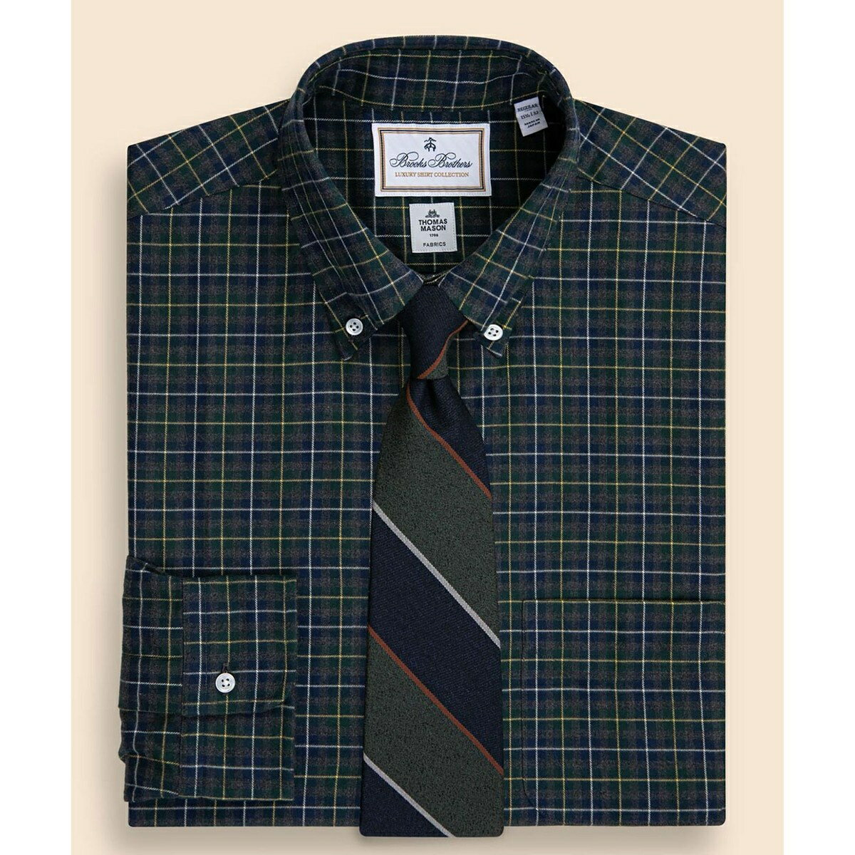 [型番:P25110330001470]THOMAS MASON(トーマス・メイソン)のラグジュアリーなシャツ生地を使用し日本国内で丁寧に縫製したドレスシャツ英国の高級シャツ生地メーカーTHOMAS MASON(トーマス・メイソン)社のコレクションから、オーセンティックな雰囲気のチェック柄の生地を選定しました。 表面を起毛させた温かみのある風合いです。 厳選されたコットン素材を使用して密に織られた光沢感のある生地が、ドレッシーな雰囲気を演出します。 ■Regular Fit:スタイリッシュな印象を与える、現代的な程よいフィット感のモデル■THOMAS MASON(トーマス・メイソン):1796年に産業革命最中の英国で創業。 卓越した色彩感覚と洗練されたテキスタイルデザイン、そして生地の質の高さで知られる世界最高峰のシャツ生地ブランド。 ■秋冬シーズン商品。 ■首回り14 1/2:39.4cm/15:40.6cm/15 1/2:41.9cm/16:43.2cm/16 1/2:44.5cm/17:45.7cm仕様・フィット:レギュラー・襟型:ポロカラー(襟の長さ8.6cm)・前立て:プラケットフロント・バックプリーツ:センターボックスプリーツ・袖丈:長袖・カフ:ラウンドバレルカフ・ポケット:左胸■カラー:グリーン14 1/2-31:胸囲108.0 着丈74.3 肩幅45.7 ウエスト104.1 ゆき80.015 - 32:胸囲113.0 着丈75.3 肩幅47.0 ウエスト109.2 ゆき82.615 1/2-32:胸囲118.1 着丈76.2 肩幅48.3 ウエスト114.3 ゆき82.616 - 33:胸囲123.2 着丈77.2 肩幅49.5 ウエスト119.4 ゆき85.116 1/2-33:胸囲128.3 着丈78.1 肩幅50.8 ウエスト124.5 ゆき85.117-34:胸囲133.4 着丈79.1 肩幅52.1 ウエスト129.5 ゆき87.6※( )で表記されている数字はヌードサイズです。 ヌードサイズとは衣服を身につけない身体のサイズです。 お客様ご自身の身体サイズと比較してお選びください。 ■素材: コットン100% ■お手入: 洗濯機使用可(ネット使用) >>商品のお取り扱い方法 ■原産国: 日本ラグジュアリー ブラッシュドコットン チェック ドレスシャツ Regular Fit セレモニー/ブルックスブラザーズ(Brooks Brothers)グリーン画面上と実物では、多少色具合が異なって見える場合がございます。