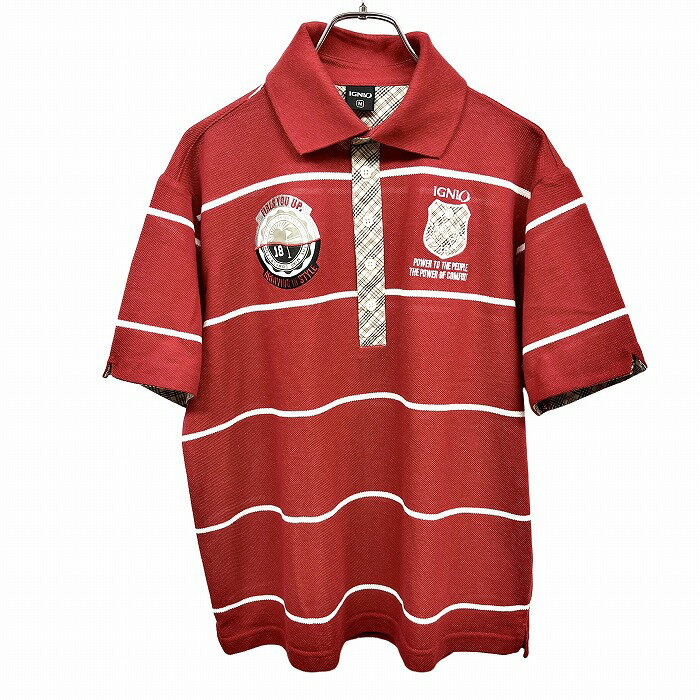 【全品ポイント10倍|開催中|〜02/10(火)01:59まで\2月お買い物マラソン/100円〜2,000円OFFクーポン配布中】【中古】イグニオ IGNIO ゴルフ ポロシャツ 鹿の子 ボーダー×チェック 半袖 英字 ロゴ ポリ×綿 M レッド 赤×ベージュ×シルバー メンズ 3,050 ~