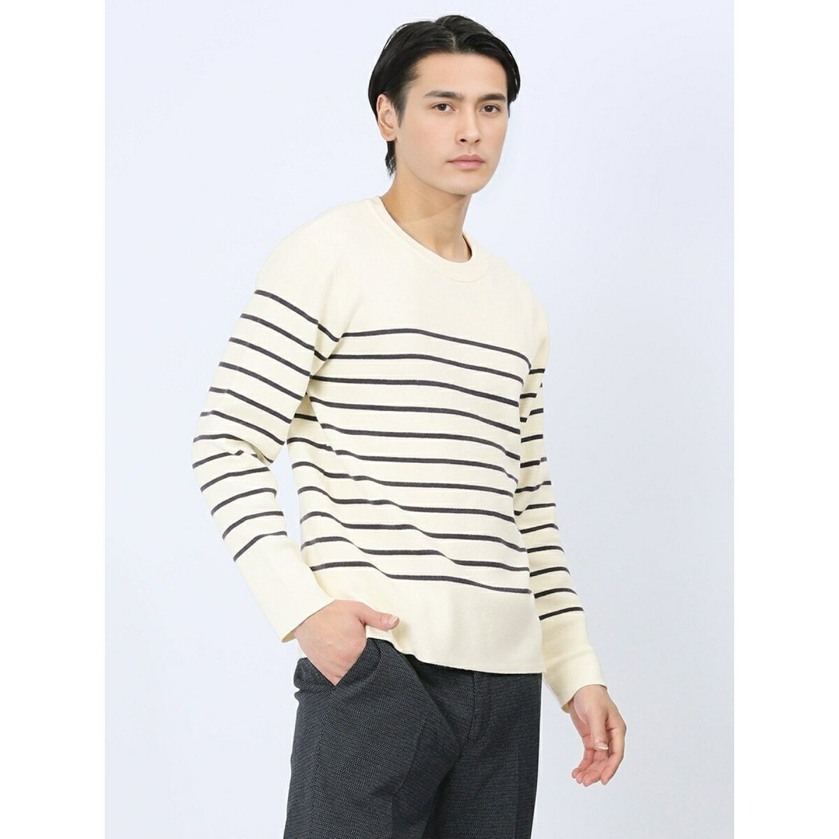 [型番:110402003402325]タカキューメンズ/TAKA-Q:MENクロスストレッチ ボーダー クルーニット■素材特徴伸縮性のあるレーヨンとポリエステルにナイロンを混紡した、天竺編みのニット素材です。 柔らかくて着心地の良いソフトな風合い、キックバック性が高く型崩れしにくい、ご家庭でお洗濯が可能なウオッシャブル機能が特徴です。 ■機能【マシンウォッシャブル】洗濯機で洗えます。 (要ネット・弱水流)■デザイン清潔感のあるボーダー柄で爽やかなルックスに仕上げた、クルーネックのニットプルオーバーです。 インナーとアウターの中間着として、肌寒い季節の防寒対策にマストなアイテム。 プライベートからオフィスカジュアルまでオンオフ兼用で着回し可能です。 ■シルエット幅広い年代の方に対応するベーシックなシルエットです。 程良くゆとりがあるのでリラックスして着用していただけます。 ■コーディネートシンプルなトラウザーパンツと合わせて綺麗目に、デニムやカーゴパンツと合わせてカジュアルに。 合わせるボトム次第で幅広いスタイリングに活躍してくれます。 フィット感:標準シーズン:秋冬展開カラー:アイボリー・黒(ブラック)・紺(ネイビー)*アテンションタグ・洗濯ネームを御確認の上、着用又は取り扱い下さい。 *光の当たる場所や高温多湿になる場所での保管は避けて下さい。 *使用の有無に関わらず、経年劣化は進行いたしますのでご了承下さい。 *生地の裁断・縫製方法により、写真と同様の柄が出ない場合がございます。 *閲覧デバイス・環境により質感・色味に誤差が生じる場合がございます。 *サイズ表に記載の寸法は実寸表記となり、商品に付属の下げ札等に記載の寸法とは異なる場合がございます。 ■カラー:02アイボリー、05黒、75紺M着丈 66/肩巾 42.5/バスト 98/袖丈 59.7/袖口巾 10L着丈 68/肩巾 44/バスト 104/袖丈 60.5/袖口巾 10.5XL着丈 69/肩巾 46/バスト 110/袖丈 61.5/袖口巾 11※( )で表記されている数字はヌードサイズです。 ヌードサイズとは衣服を身につけない身体のサイズです。 お客様ご自身の身体サイズと比較してお選びください。 ■素材: レーヨン52% ポリエステル28% ナイロン20% ■お手入: >>商品のお取り扱い方法 ■原産国: 中国タカキュー クロスストレッチ ボーダー クルーニット/タカキュー(TAKA-Q)02アイボリー05黒75紺画面上と実物では、多少色具合が異なって見える場合がございます。