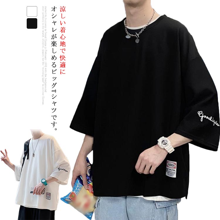 Tシャツ 7分袖 カットソー ビッグシルエット メンズ ビッグTシャツ トップス ゆったり ドロップショルダー カジュアル オーバーサイズ 大きいサイズ スリット 普段着 旅行 送料無料 3,030 ~