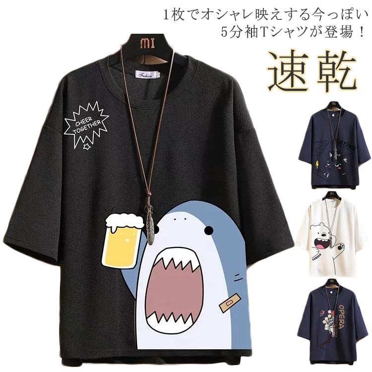 メンズ トップス カットソー 五分袖Tシャツ 夏服 クルーネック メンズトップス ティーシャツ ネコ柄 クマ柄 魚柄 半袖 ビッグシ 1,780 ~
