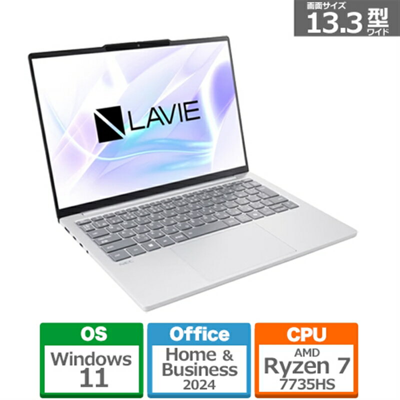 お取寄せの場合の納期目安:3月下旬以降(3/6現在)・薄さと軽さを兼ね備えたコンパクトで堅牢なボディ・充実のインターフェイス・多くのデータを保存できる大容量約512GB SSD搭載薄型・軽量ボディ約1175gの軽さと15mmの薄さを実現。 カバンに入れても負担にならないモバイルパソコンの理想形。 またMIL規格準拠の試験*もクリアしており、持ち運びも安心です。 *:アメリカ国防総省が制定したアメリカ軍が調達する資材に関する規格。 MIL規格(MIL-STD-810H)に準拠したテストを実施し、毎日の持ち運びや、利用を想定した耐久性を実現しています。 商品の無破損、無故障、耐久性を保証するものではありません。 充実のインターフェイス変換アダプタなしに多様な周辺機器が接続できます。 大容量SSD(約512GB搭載)写真や動画などのデータをたくさん保存できます。 かしこく節電して長時間使えるロングバッテリーモード外出先での長時間のパソコン利用時に、バッテリー残量が気になるシーンで活躍するのがロングバッテリーモードです。 かしこく節電し、バッテリー駆動時間を延ばすことができ、モード選択時には利用可能な時間*を確認することもできます。 13.3型の大きくてきれいなIPS液晶写真や動画をより鮮やかな画質で楽しめて、作業もより快適にできます。 *:当社独自の予測手法により算出しためやす時間です。 設定やご利用状況によって、実際のバッテリー利用可能な時間は異なります。 ≪メーカーキャンペーン対象商品≫「NEC LAVIEが春を応援!キャッシュバックキャンペーン」購入対象期間:2026年2月3日(火)〜2026年4月19日(日)こちらの商品は「ひと家族様1点限り」となります。 同一お届け先、同一名義による2点以上のご注文、または当店が転売目的と判断した場合、ご注文を取消しさせていただく場合がございます。 ●インストールOS・サポートOS:Windows 11 Home 64ビット●プロセッサー:AMD Ryzen 7 7735HS プロセッサ●外形寸法(突起部、バンプ部除く)*28 *30:295.6 (W)×209.5 (D)×15 (H)mm●質量:(内蔵バッテリパック含む):約1175g / ACアダプタ:約175g●オフィスアプリ:Microsoft 365 Basic + Office Home & Business 2024●主な添付品:マニュアル、小型軽量ACアダプタ (USB-C・ウォールマウント型)、保証書※こちらの商品はお一人さま1点限りとなります。 同一お届け先への複数注文、同一名義による複数注文等、当店が転売目的と判断した場合、ご注文を取消しさせていただく場合がございます。