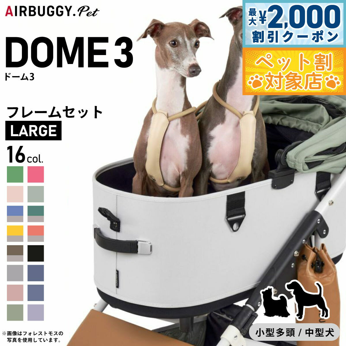 新しくなったDOME3は、室内空間が約20%アップ。 内部空間にゆとりが生まれ、多頭飼いや、より大きな犬種でも快適にお使いいただけるようになりました。 コットは180度開くオープンエアルーフを採用。 左右どちらからでもワンタッチで開閉できます。 持ち運びは、両手のハンドルで安全に。 エアバギーならではの快適な走り心地はそのままに、出入りしやすく、よりスマートに生まれ変わりました。 商品名エアバギー フォー ペット AIRBUGGY FOR PET ペットカート ドーム3 セット 数量限定カラーブランドAIR BUGGY材質フレーム:アルミニウム・樹脂、コット表地:ポリエステル100%、コット内部:底面PEボード耐荷重20kg(小型多頭・中型犬・体高の高い犬種におすすめ)大きさフレーム(使用時:H105cm / D96cm / W53.5cm、折畳時:H82cm / D30cm / W53.5cm)、コット単体(外 寸:H58.5cm / D72cm / W37cm、内 寸:H52cm / D66cm / W32cm)生産国中国 ラージサイズ:小型多頭、柴犬・ビーグルなどの中型犬、アメリカンコッカーなど体高の高い犬種におすすめ。 標準装備:コット取り付けアダプター、バスケット(17L)、マルチホルダー×2個、リストストラップ、エアポンプ、飛び出し防止用リード(コット内に装備)×2個、取扱説明書DOME3の機能 180度開閉アコーディオンルーフ(左右どちらからでも開閉でき、好きな角度で固定できるオープンエアルーフ。 最大180度開くので、外の様子もよく見えて開放感たっぷり。 日よけとしても使えて、乗り降りもスムーズに。 )ワンタッチFIDLOCK (マグネット内蔵のFIDLOCK を両サイドに採用。 ルーフを近づけると、磁力でロックがかかります。 外す時は指でストラップを引っ張るだけ。 自然に外れることがないので安全性が高く、ワンアクションで開閉できる、スタイリッシュなロックです。 )キャリーハンドル(両サイドのハンドルは、伸縮式ですべりにくく、さらに持ちやすくなりました。 フレームからの着脱や、ちょっとした移動の際、重量のあるペットを乗せてもムリなく安全に持ち運びができます。 )らくらくワンタッチ装着(レバーを引くだけのワンアクションで、フレームから簡単に取り外しが可能。 お部屋でも、クルマでも、どこでもストレスなく持ち運びできます。 )折りたたみ可能(フレームは、ハンドルの左右のレバーを握って降ろせばかんたんに折りたたみ可能。 厚さ30cmになるので、クルマでも玄関でも場所をとりません。 )便利なマルチホルダー(フレームの両サイドには小物や500mlのペットボトルが入るマルチホルダーを装備。 保冷・保温機能付きなので、暑い季節も快適にお散歩できます。 )本体下部に17Lの大容量バスケットを搭載。 両サイドのジッパーで開閉でき、荷物の出し入れもスムーズです。 急な買い物など、荷物が増えても安心です。 (耐荷重5kg)コット:4.1kg、フレーム+コット取り付けアダプター:8kg、フレーム+コット取り付けアダプター+コット:12.1kgメーカー名株式会社GMPインターナショナルエアバギー フォー ペット AIRBUGGY FOR PET ペットカート ドーム3 セット 数量限定カラー新しくなったDOME3は、室内空間が約20%アップ。 内部空間にゆとりが生まれ、多頭飼いや、より大きな犬種でも快適にお使いいただけるようになりました。 コットは180度開くオープンエアルーフを採用。 左右どちらからでもワンタッチで開閉できます。 持ち運びは、両手のハンドルで安全に。 エアバギーならではの快適な走り心地はそのままに、出入りしやすく、よりスマートに生まれ変わりました。