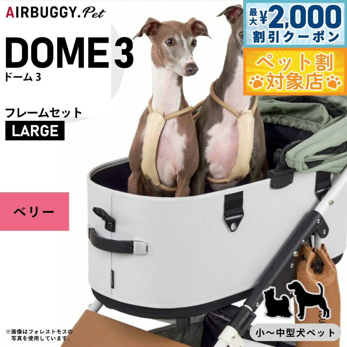 『 DOMEシリーズの最終形、ここに誕生。 』新しくなったDOME3は、室内空間が約20%アップ。 内部空間にゆとりが生まれ、多頭飼いや、より大きな犬種でも快適にお使いいただけるようになりました。 コットは180度開くオープンエアルーフを採用。 左右どちらからでもワンタッチで開閉できます。 持ち運びは、両手のハンドルで安全に。 エアバギーならではの快適な走り心地はそのままに、出入りしやすく、よりスマートに生まれ変わりました。 商品名エアバギー フォー ペット ドーム3 セットブランドAIR BUGGY材質フレーム:アルミニウム・樹脂、コット表地:ポリエステル100%、コット内部:底面PEボード耐荷重20kg(小型多頭・中型犬・体高の高い犬種におすすめ)大きさフレーム(使用時:H105cm / D96cm / W53.5cm、折畳時:H82cm / D30cm / W53.5cm)、コット単体(外 寸:H58.5cm / D72cm / W37cm、内 寸:H52cm / D66cm / W32cm)生産国中国 ラージサイズ:小型多頭、柴犬・ビーグルなどの中型犬、アメリカンコッカーなど体高の高い犬種におすすめ。 標準装備:コット取り付けアダプター、バスケット(17L)、マルチホルダー×2個、リストストラップ、エアポンプ、飛び出し防止用リード(コット内に装備)×2個、取扱説明書DOME3の機能 180度開閉アコーディオンルーフ(左右どちらからでも開閉でき、好きな角度で固定できるオープンエアルーフ。 最大180度開くので、外の様子もよく見えて開放感たっぷり。 日よけとしても使えて、乗り降りもスムーズに。 )ワンタッチFIDLOCK (マグネット内蔵のFIDLOCK を両サイドに採用。 ルーフを近づけると、磁力でロックがかかります。 外す時は指でストラップを引っ張るだけ。 自然に外れることがないので安全性が高く、ワンアクションで開閉できる、スタイリッシュなロックです。 )キャリーハンドル(両サイドのハンドルは、伸縮式ですべりにくく、さらに持ちやすくなりました。 フレームからの着脱や、ちょっとした移動の際、重量のあるペットを乗せてもムリなく安全に持ち運びができます。 )らくらくワンタッチ装着(レバーを引くだけのワンアクションで、フレームから簡単に取り外しが可能。 お部屋でも、クルマでも、どこでもストレスなく持ち運びできます。 )折りたたみ可能(フレームは、ハンドルの左右のレバーを握って降ろせばかんたんに折りたたみ可能。 厚さ30cmになるので、クルマでも玄関でも場所をとりません。 )便利なマルチホルダー(フレームの両サイドには小物や500mlのペットボトルが入るマルチホルダーを装備。 保冷・保温機能付きなので、暑い季節も快適にお散歩できます。 )本体下部に17Lの大容量バスケットを搭載。 両サイドのジッパーで開閉でき、荷物の出し入れもスムーズです。 急な買い物など、荷物が増えても安心です。 (耐荷重5kg)コット:4.1kg、フレーム+コット取り付けアダプター:8kg、フレーム+コット取り付けアダプター+コット:12.1kgメーカー名株式会社GMPインターナショナルエアバギー フォー ペット ドーム3 セット 『 DOMEシリーズの最終形、ここに誕生。 』新しくなったDOME3は、室内空間が約20%アップ。 内部空間にゆとりが生まれ、多頭飼いや、より大きな犬種でも快適にお使いいただけるようになりました。 コットは180度開くオープンエアルーフを採用。 左右どちらからでもワンタッチで開閉できます。 持ち運びは、両手のハンドルで安全に。 エアバギーならではの快適な走り心地はそのままに、出入りしやすく、よりスマートに生まれ変わりました。
